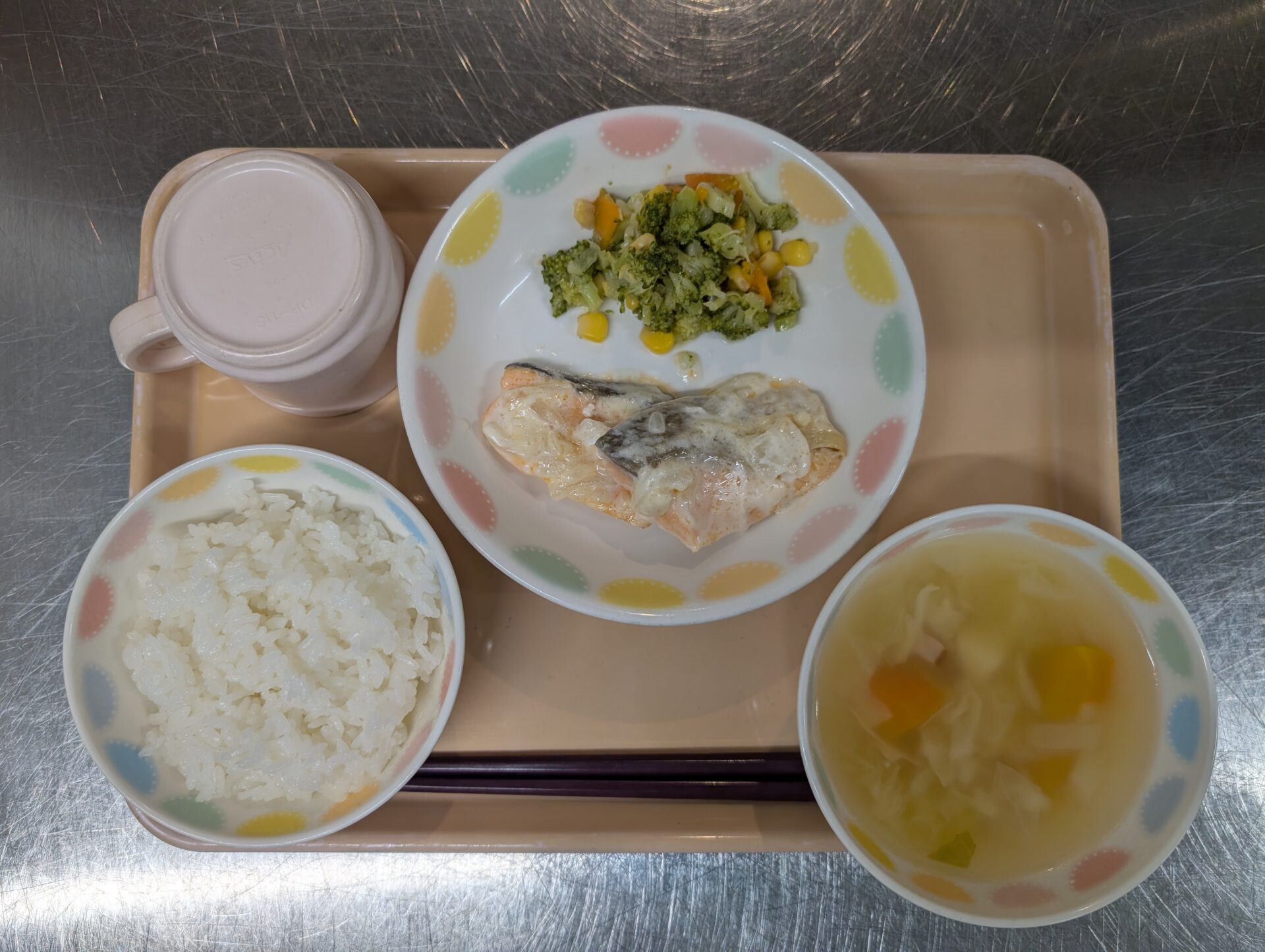 今日のメニューは、ご飯、鮭のマヨネーズ焼き、ブロッコリーのサラダ、ポトフ風スープ。