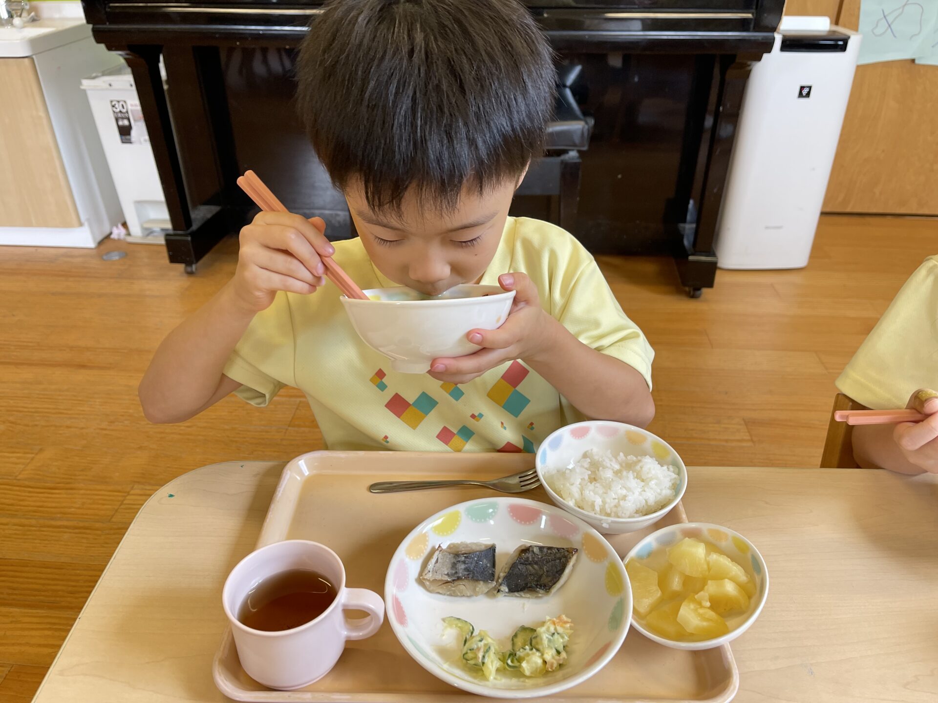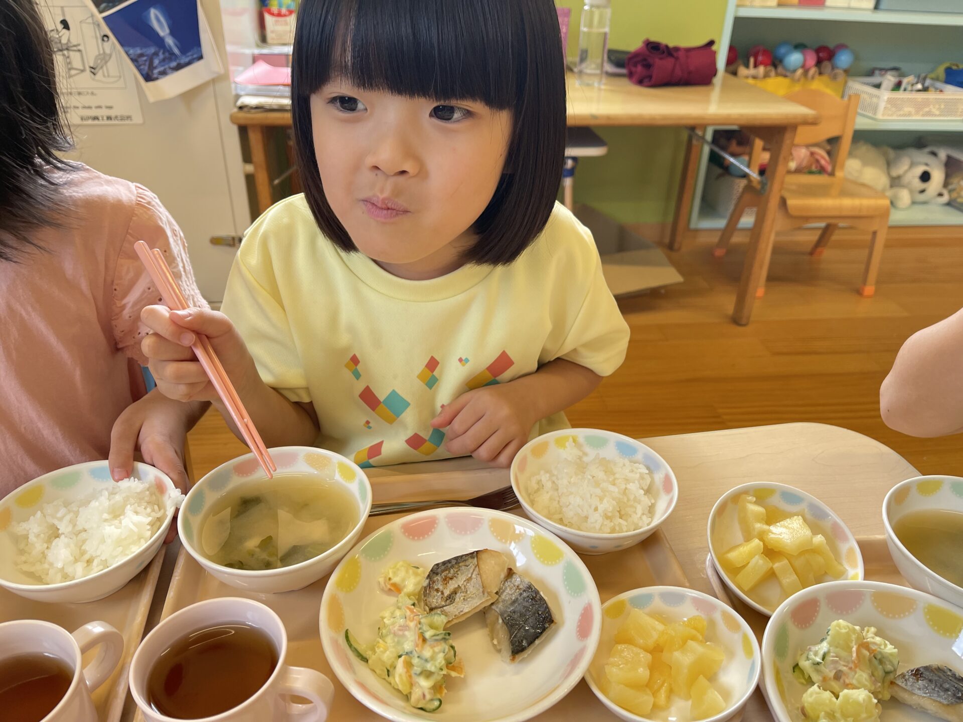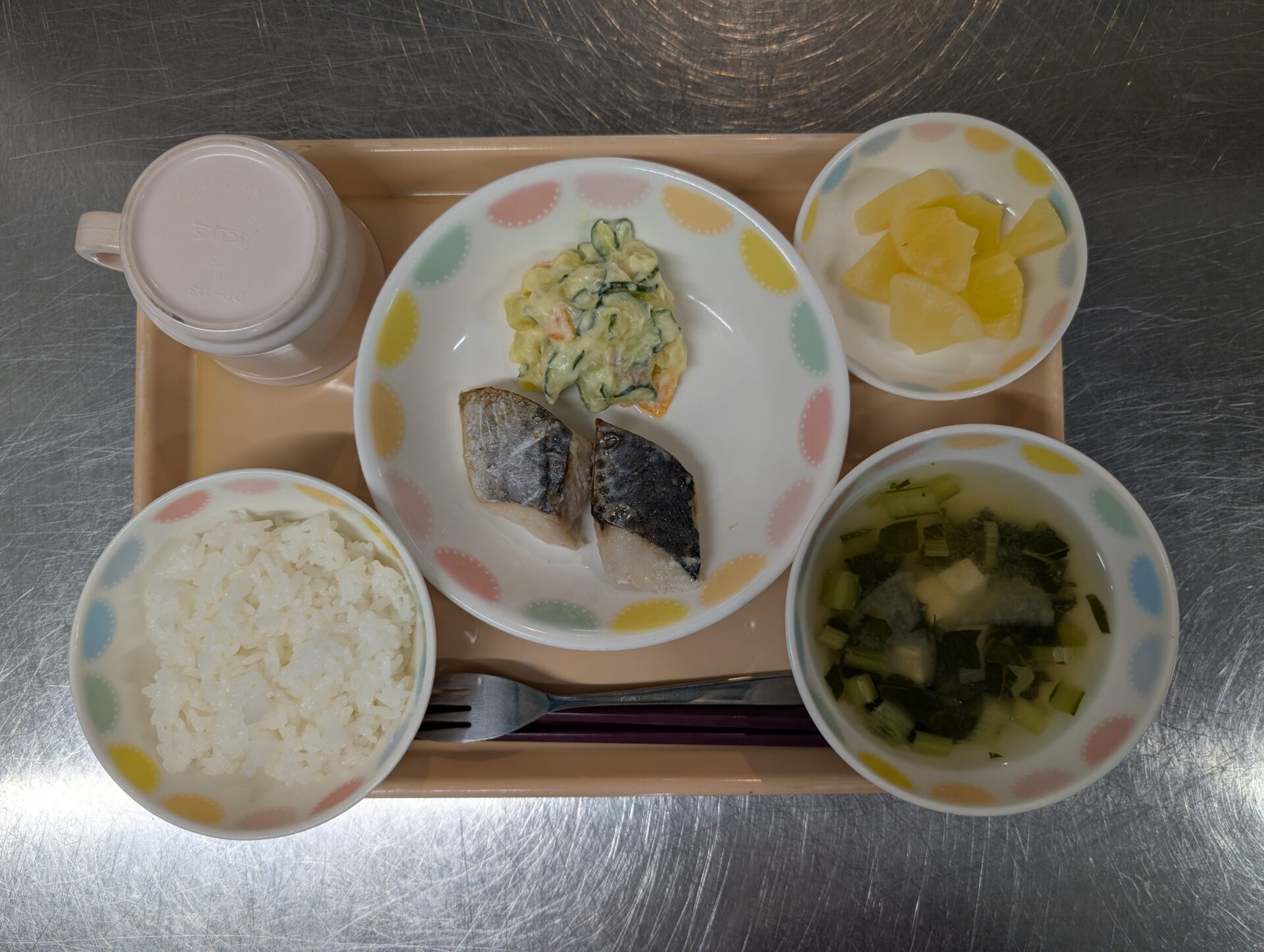 今日のメニューは、ご飯、さわらの塩こうじ焼き、さつまいもサラダ、味噌汁、パイン缶。