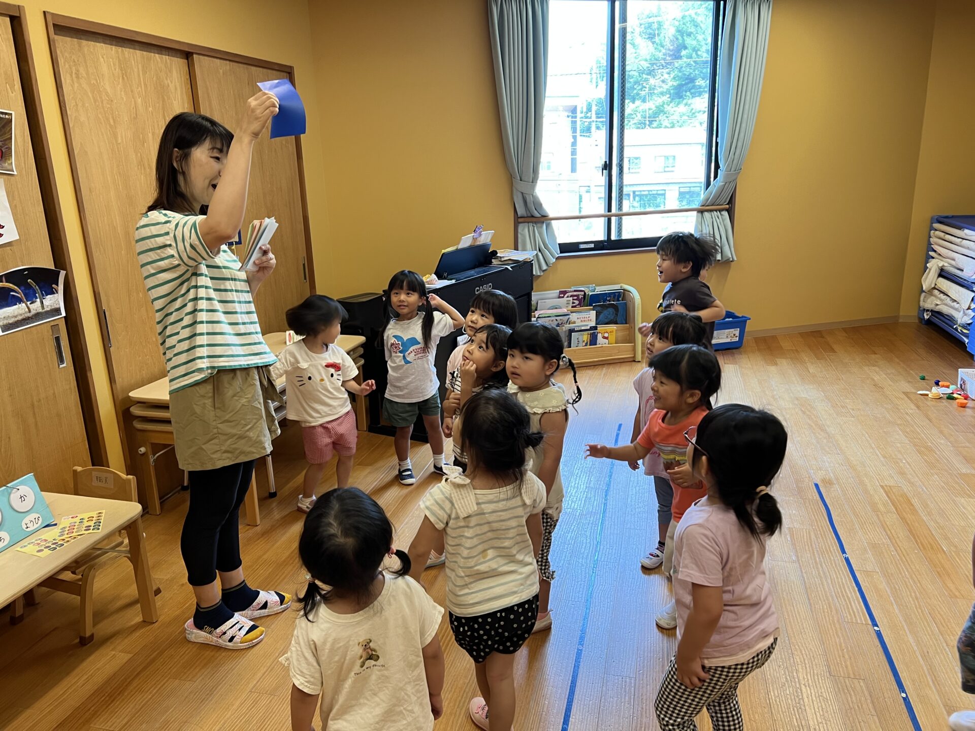 暑さ対策の為、早い時間帯にあがって水遊びを楽しんだ3歳児・にじチーム。お給食には、もう少し時間があるので、E先生が【色探しゲーム】を始めました😊