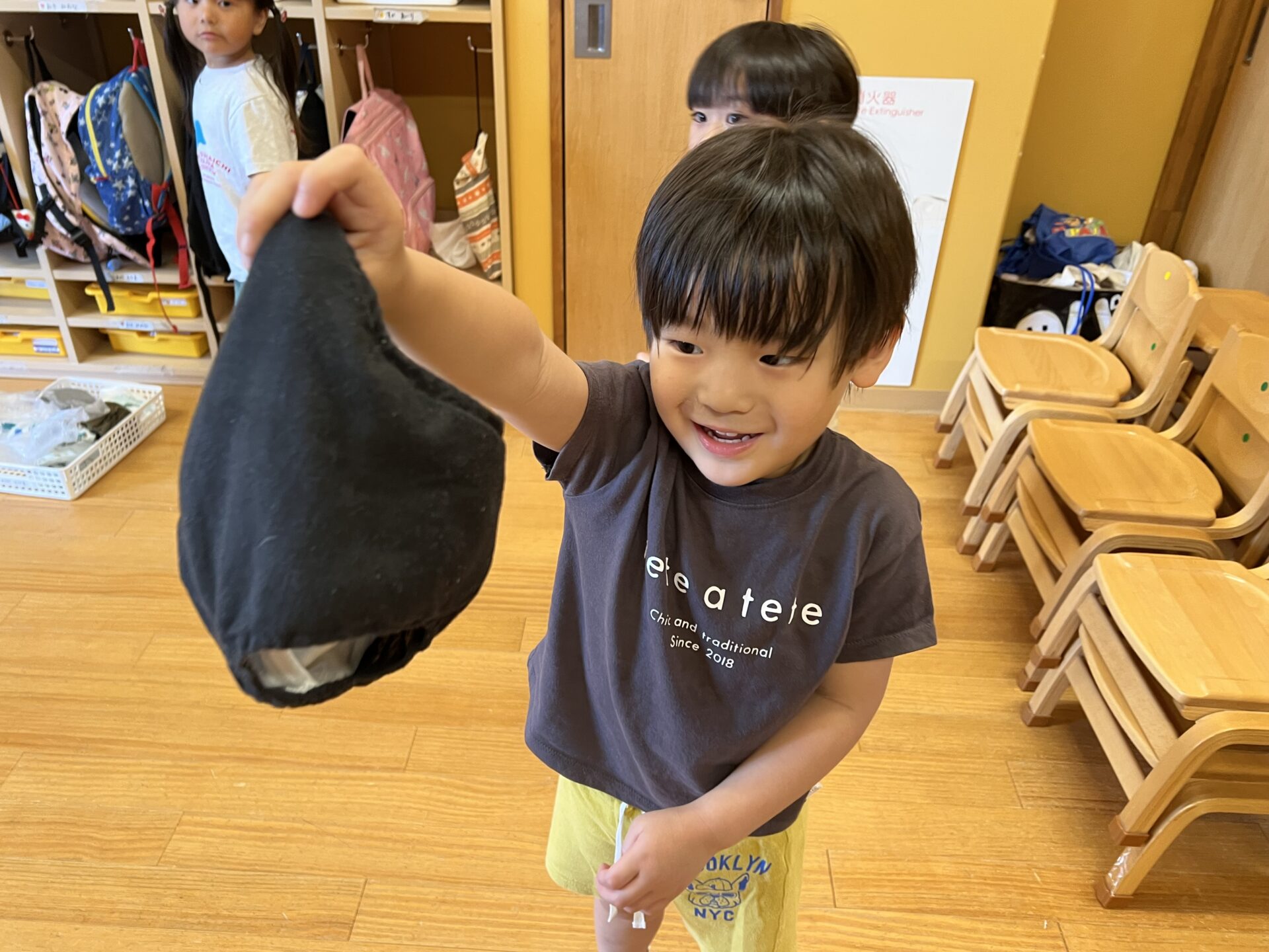 『黒色どーこだ?』と言われたら、すぐに自分のかごの中から、まさかの【パンツ】を見つけてきたTくん(笑)先生達は、すごい発見にびっくり😄大笑いしてしまいました。