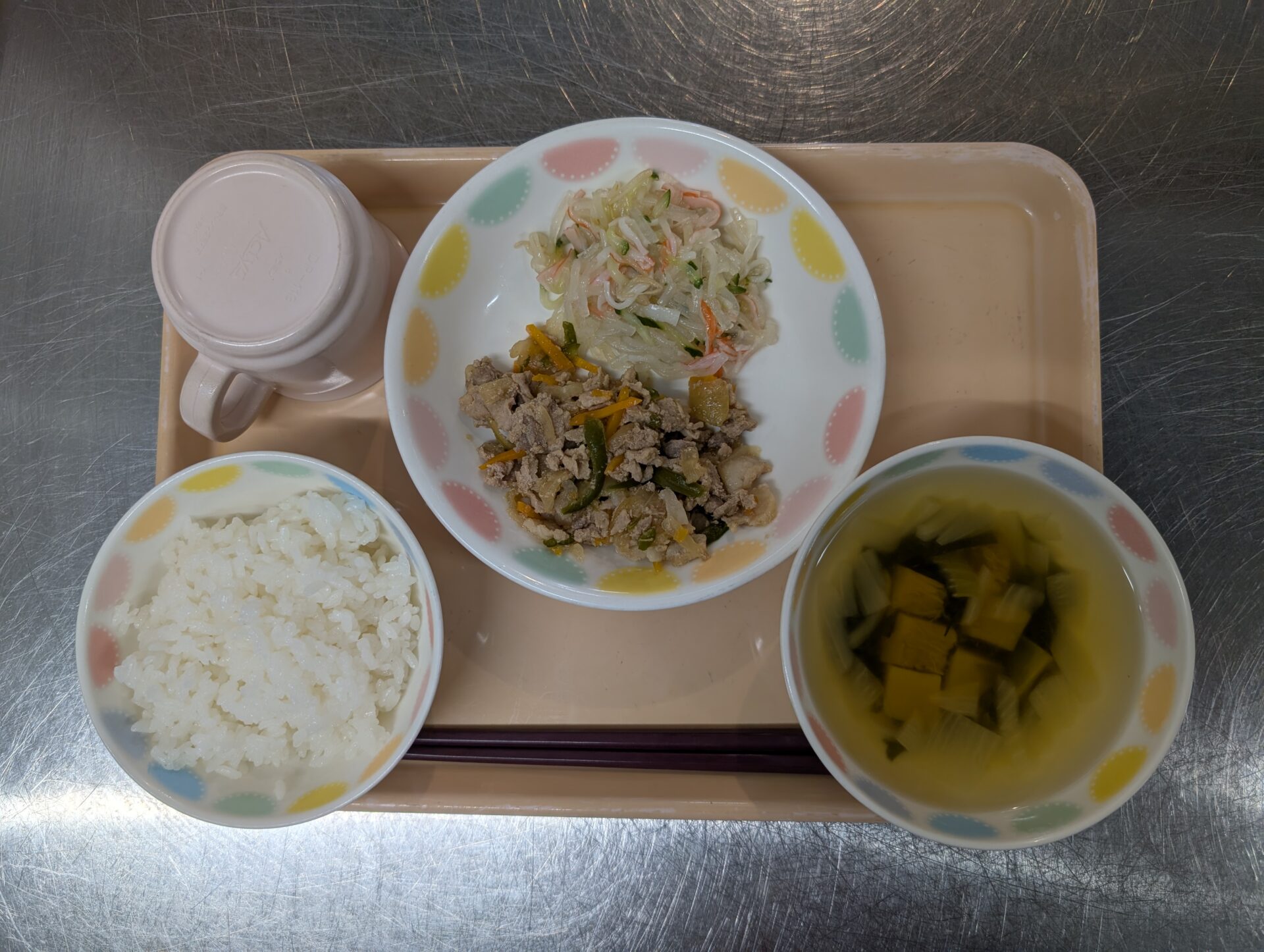 今日の給食メニューは、ご飯、豚のしょうが焼き、春雨サラダ、かぼちゃのすまし汁です。
