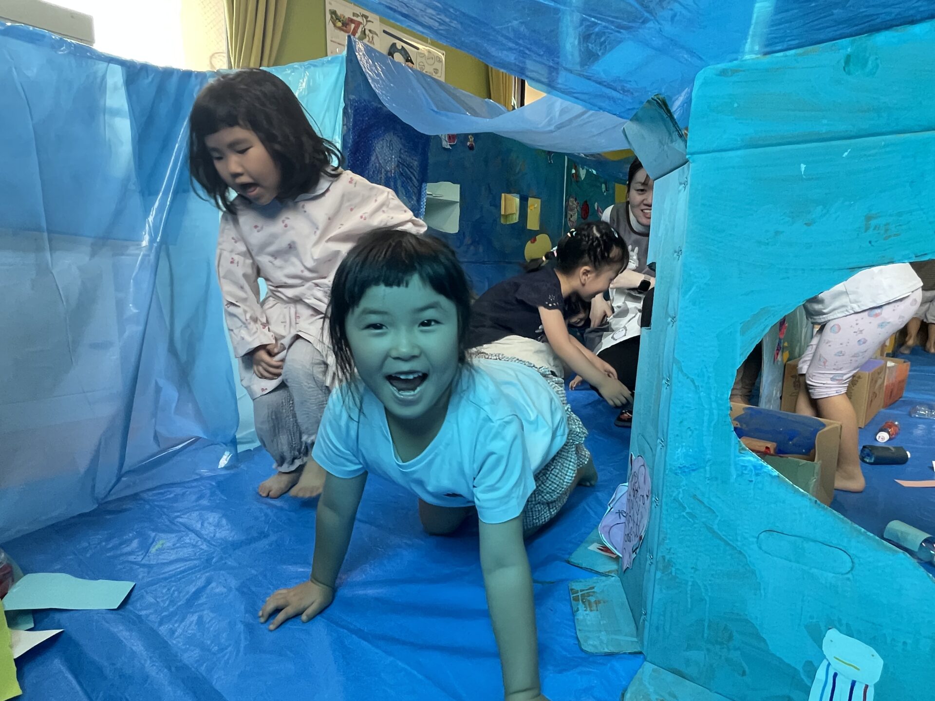 5歳児・くじらチームさんは、自分たちが作った自慢のすいぞくかんのトンネル。乳児さんにも大人気で、みんな大喜びで遊んでいました😊