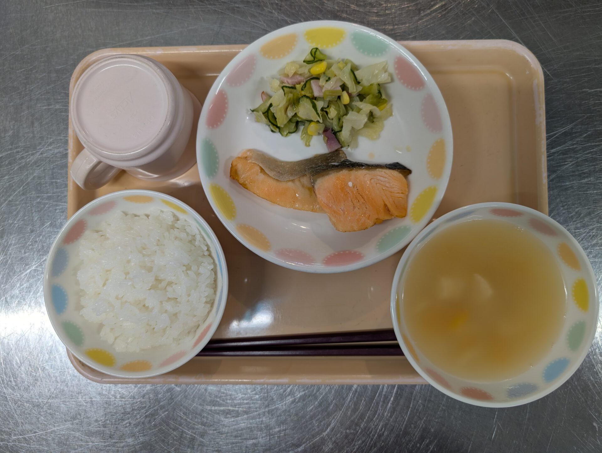 今日の給食メニューは、ご飯、鮭の塩焼き、キャベツとコーンの和え物、のっぺい汁です。
