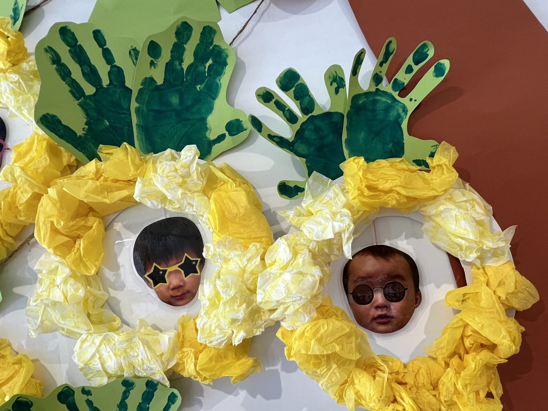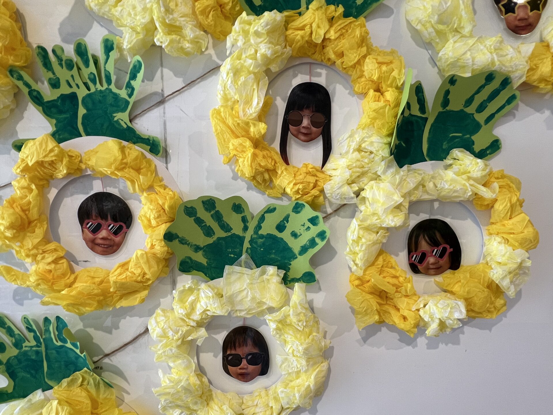 前回、手形をとってたので何になるのかな?と楽しみにしていたら、今日は、お花紙を使って製作をしていました😊上手に丸めて貼っていくと、「パイナップル」になりました。