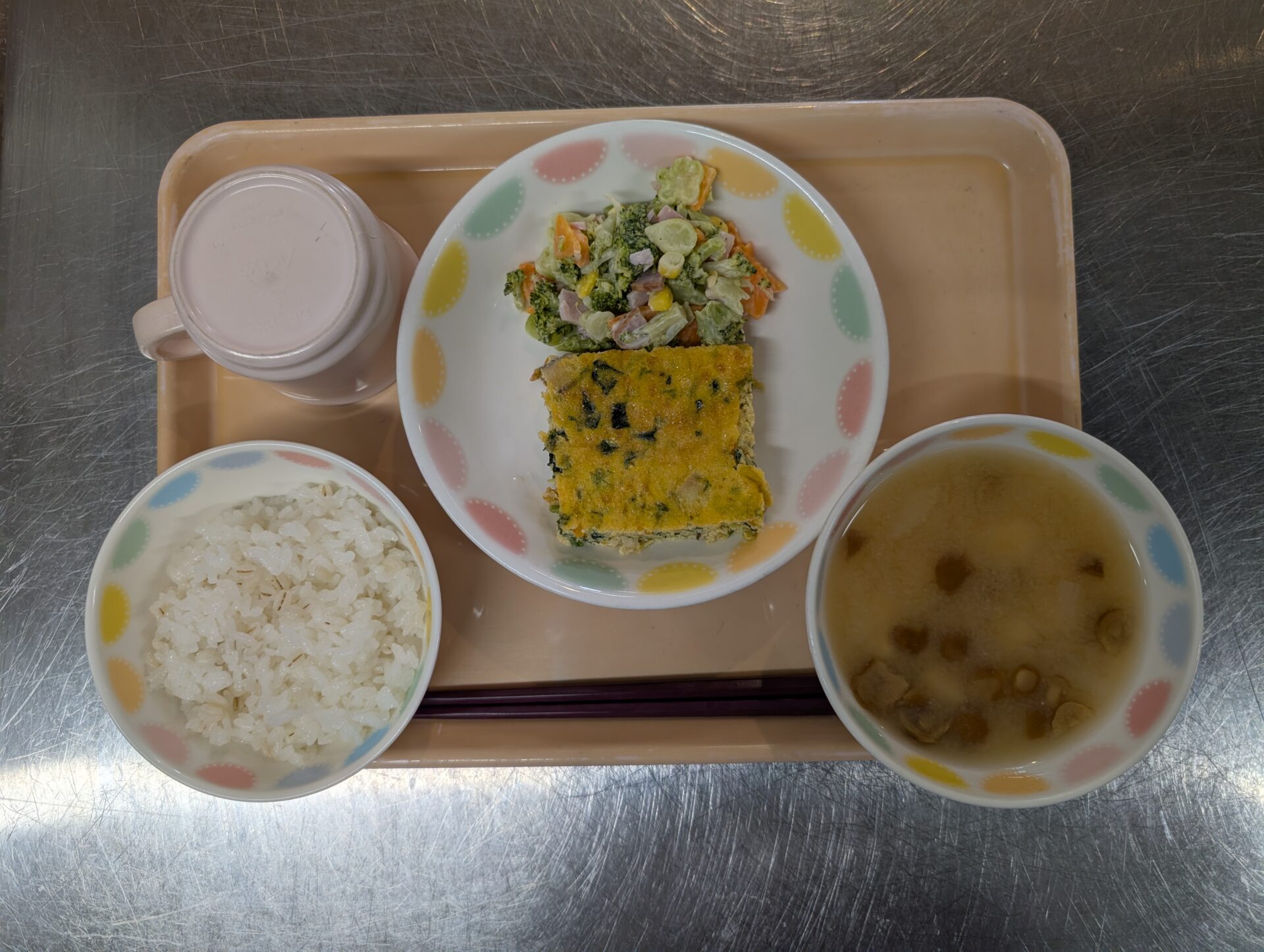 今日のメニューは、麦ご飯、千草焼き、ブロッコリーのサラダ、なめこの味噌汁