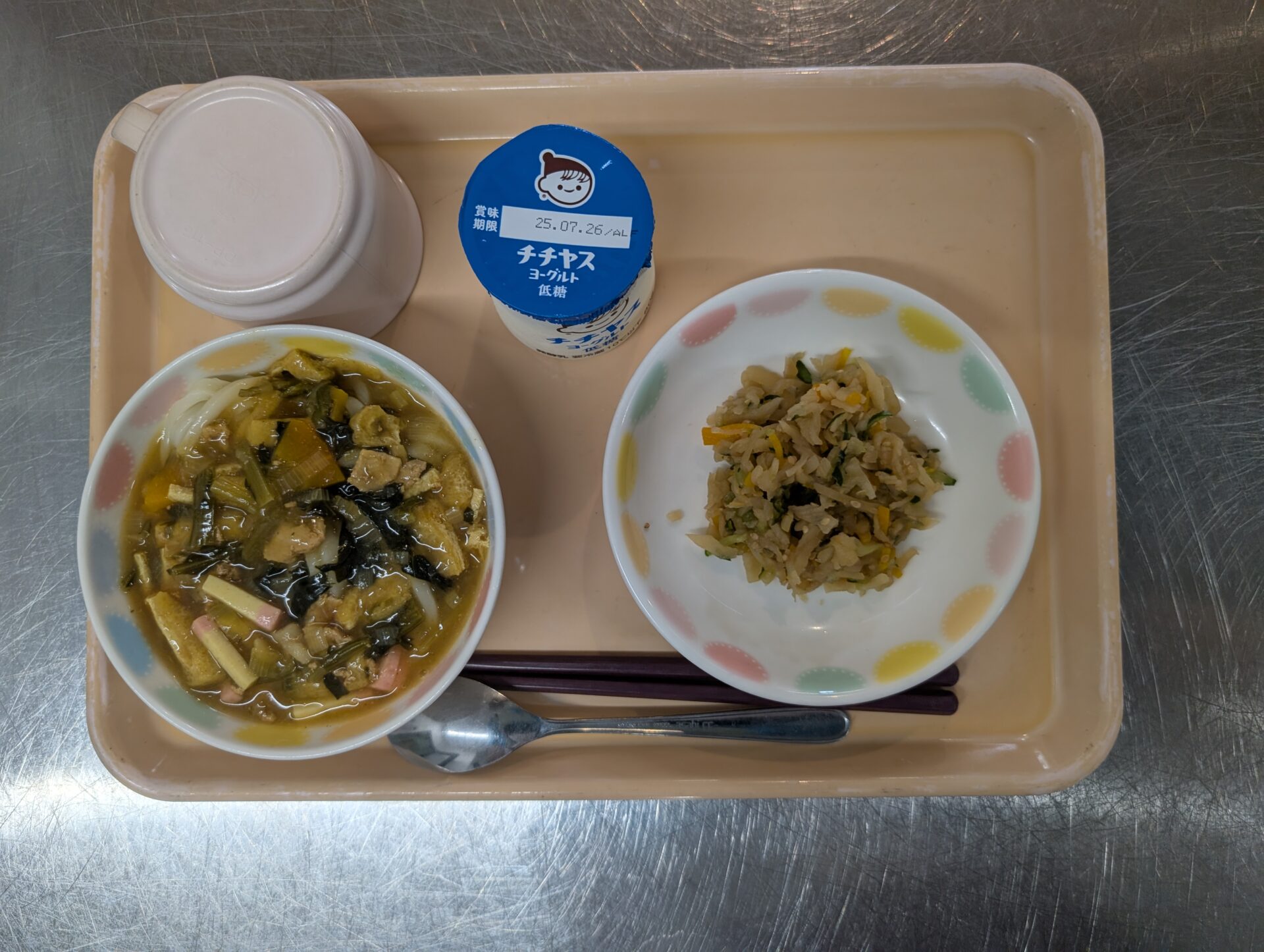 今日の給食は、カレーうどん、切干大根の胡麻和え、カップヨーグルトです。