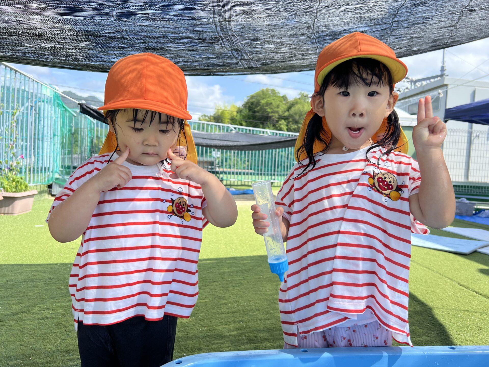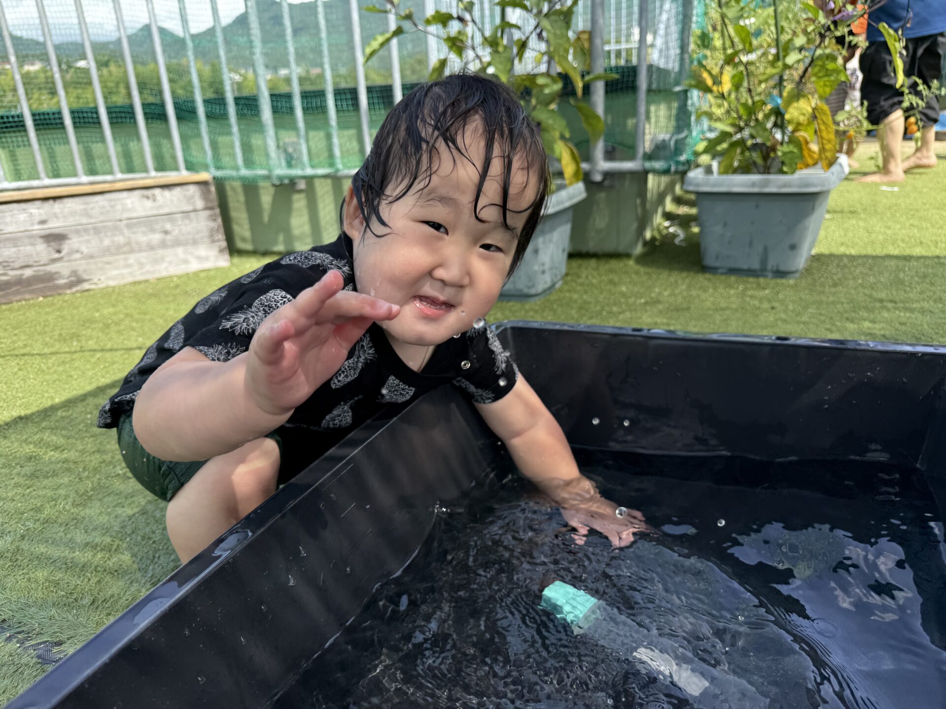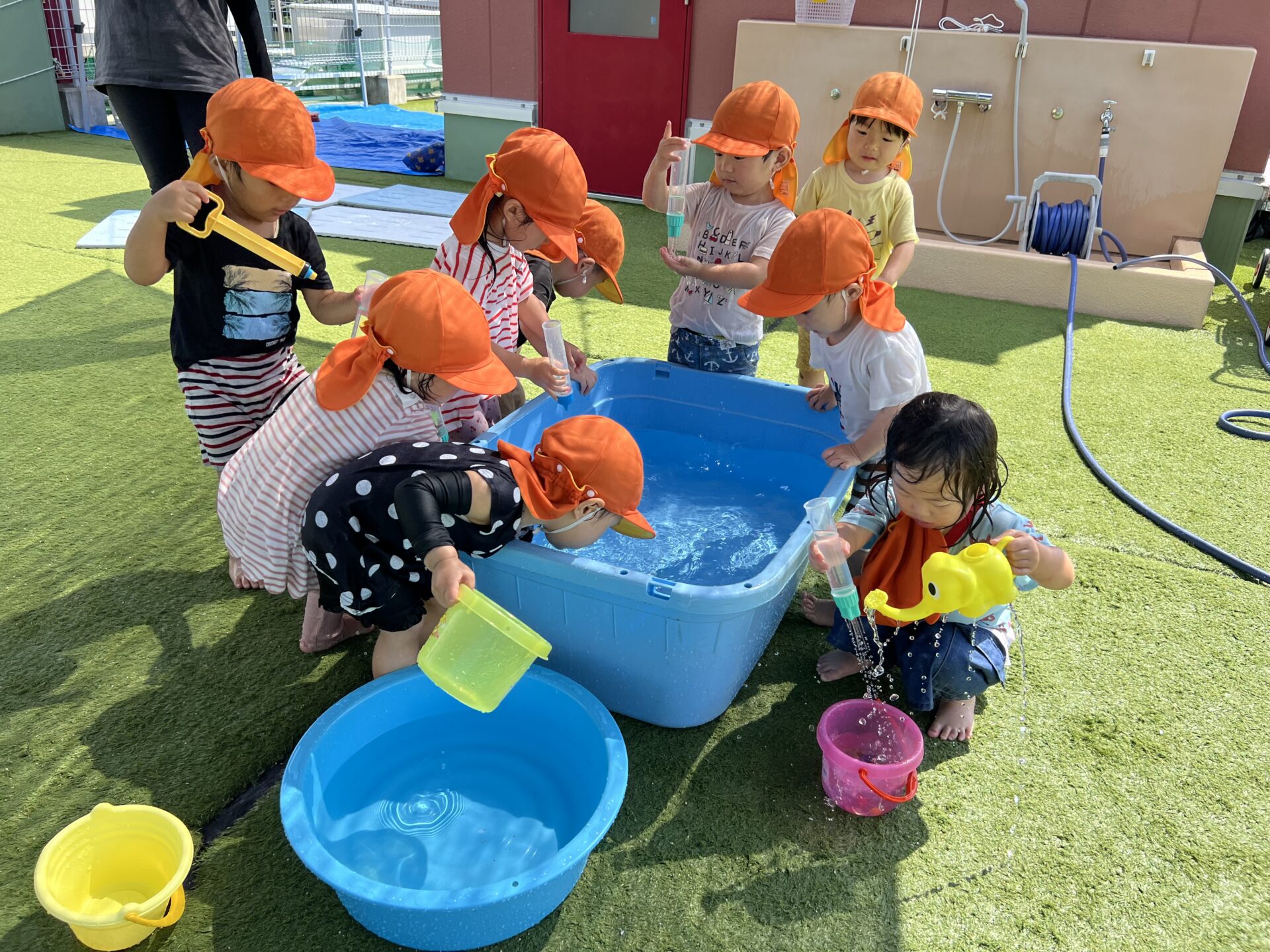 今日もとてもいい天気でした。雨が降るかも?と予報されていましたが、みんなの水遊びしたい気持ちが勝ったのでしょうね。