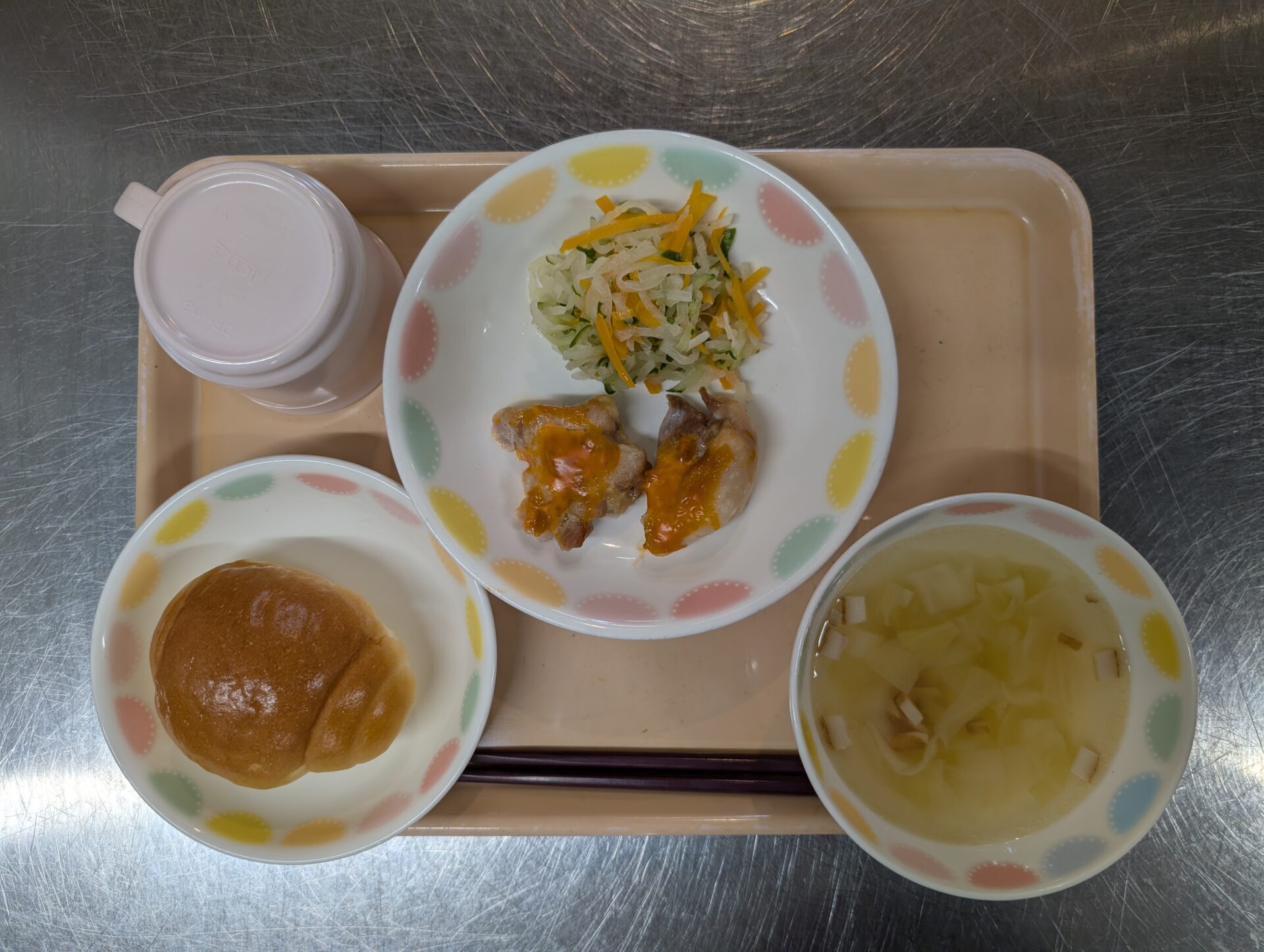 今日のメニューは、ロールパン 鶏肉のオーロラソース焼き 千切りサラダ ポトフ風スープ