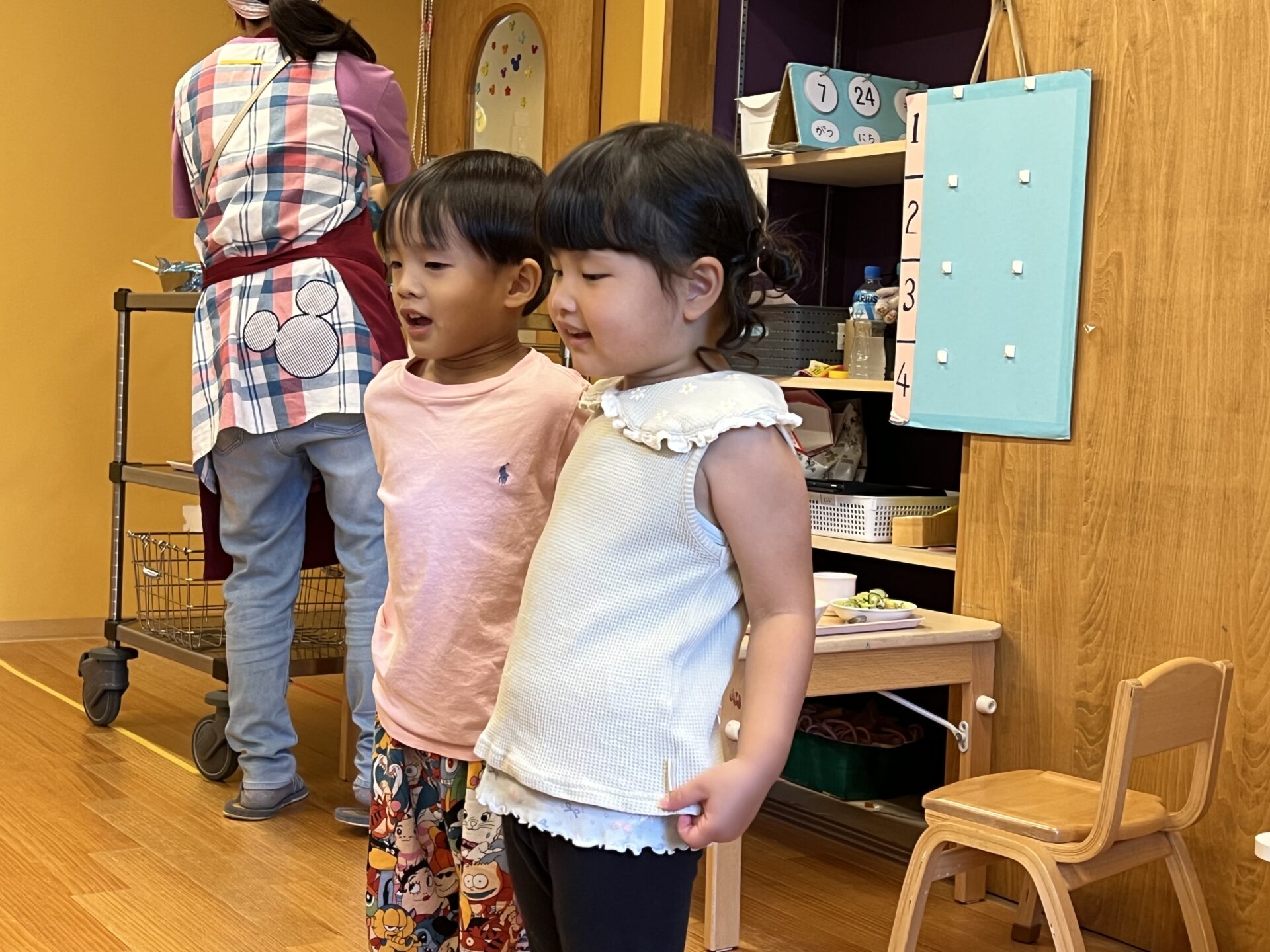 今日のお当番さんは、KくんとYちゃん。張り切ってメニューの発表をしています😊