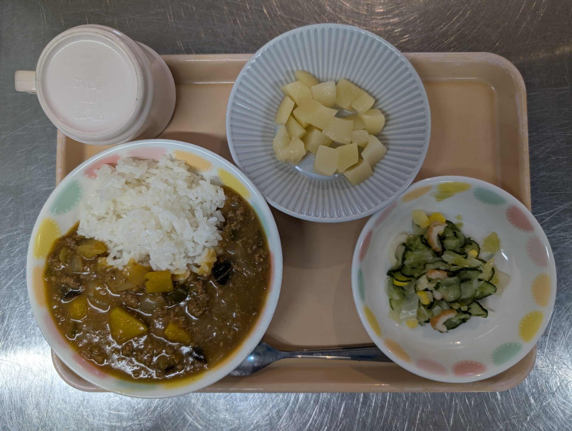 『きょうのきゅうしょくは、なつやさいかれーとこーんさらだとももかんです😊』