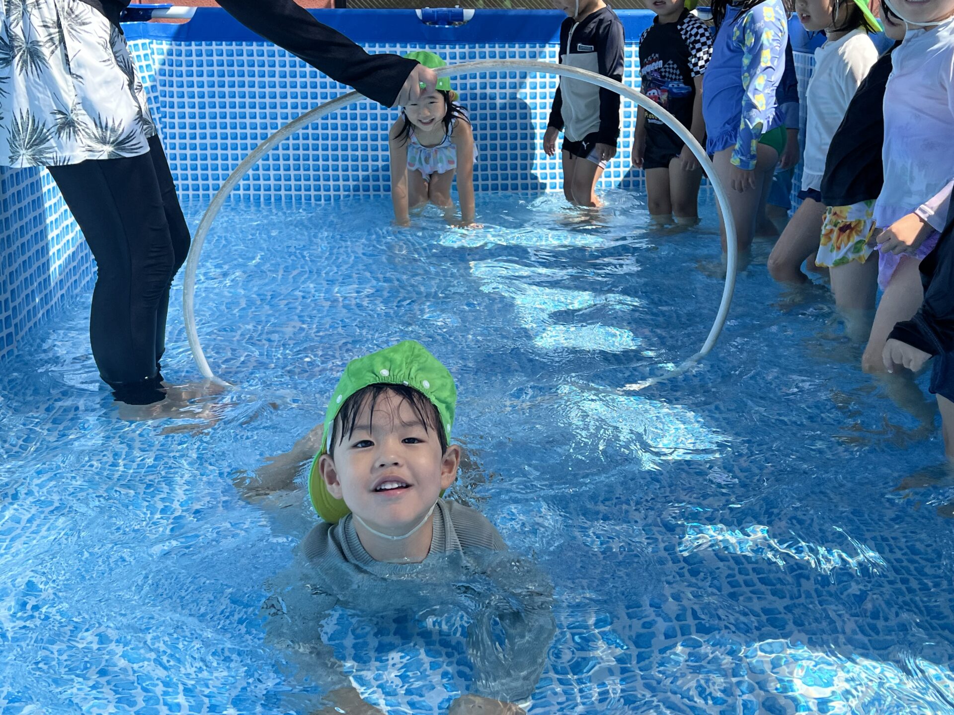 屋上園庭では、4歳児・そらチームさんが、プール遊びを楽しんでいました😊フラフープに当たらないように、わにさん泳ぎが上手です。