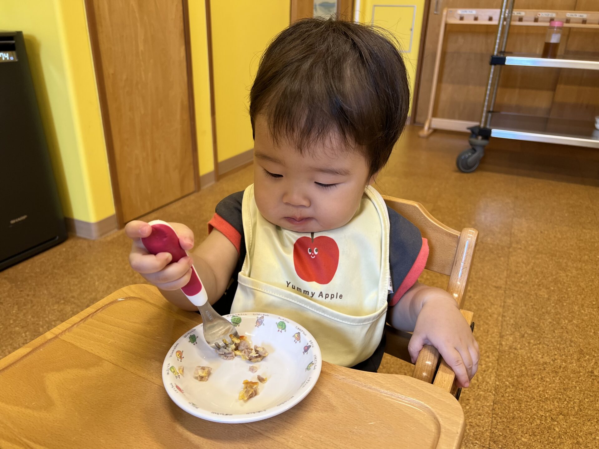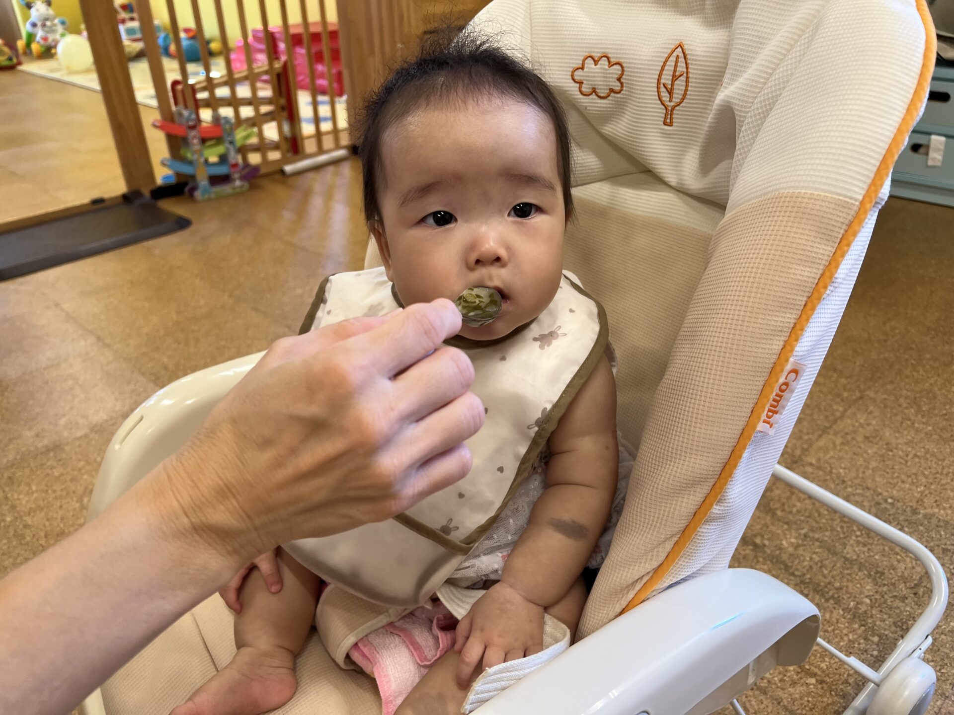 0歳児・うみチームさんのNくん😊もうすぐ6ヶ月になります。うつ伏せで、遊べる時間も長くなって、しっかり胸があがるようになりました。先生たちは、Nくんの笑顔に毎日癒されています😚
