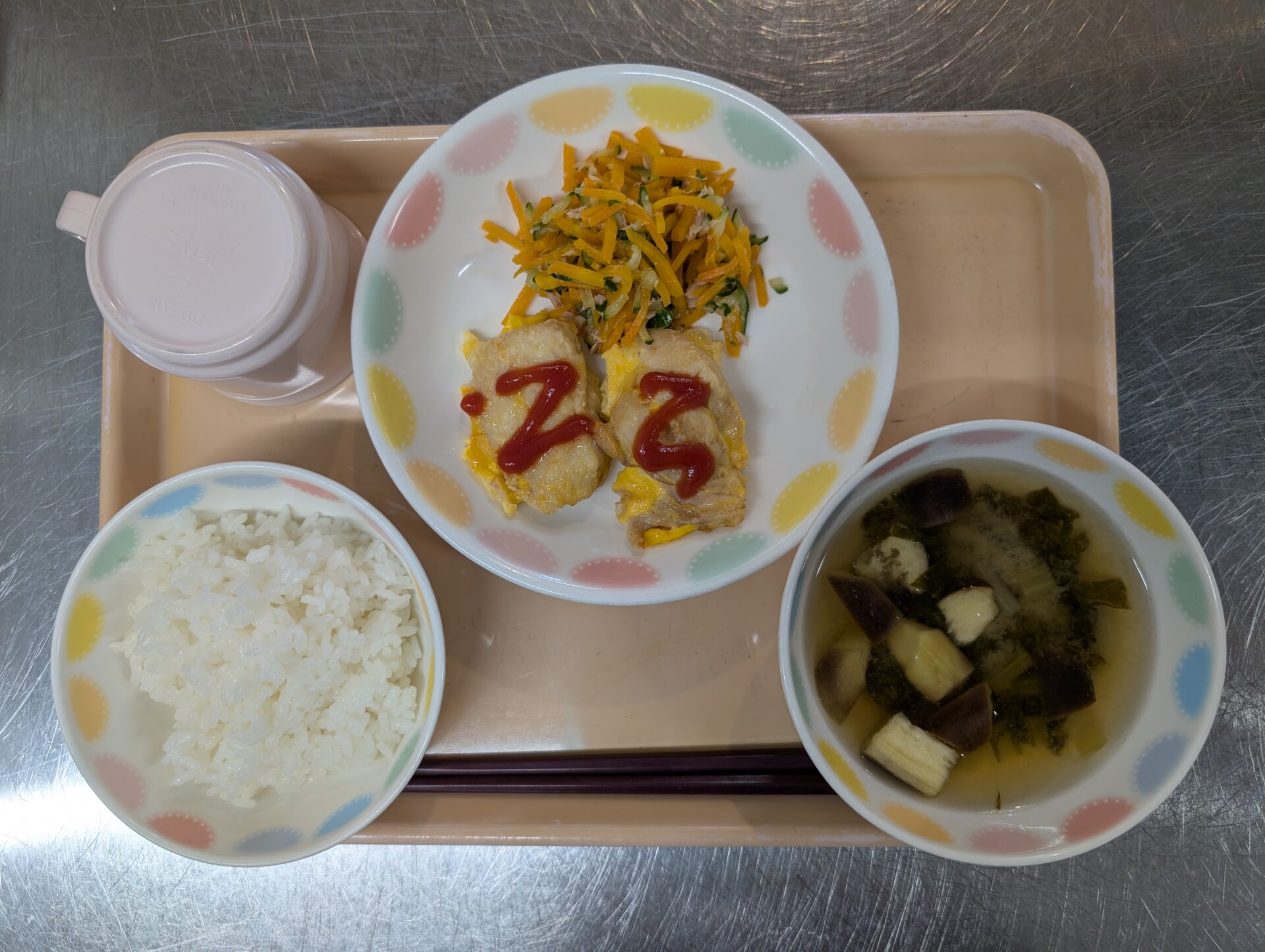 今日の給食は、ご飯、鶏肉のピカタ、にんじんサラダ、なすの味噌汁です。