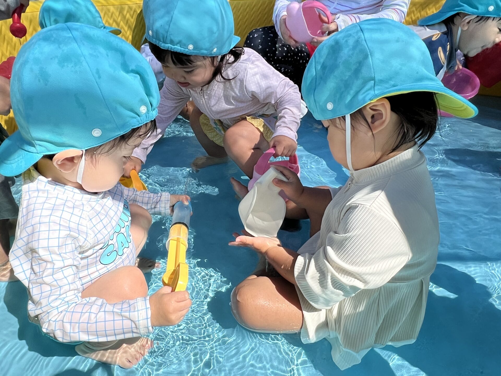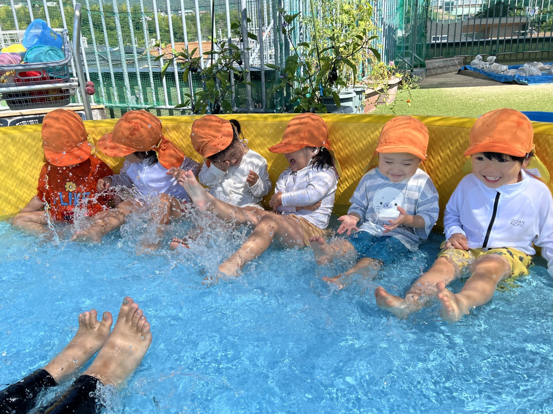 幼児チームが体操教室だったので、屋上園庭は、乳児チームの貸し切り!!すっかり、プール遊びにも慣れてきた1歳児・だいちチームさんです😊早く入りたくて大喜びでした✨