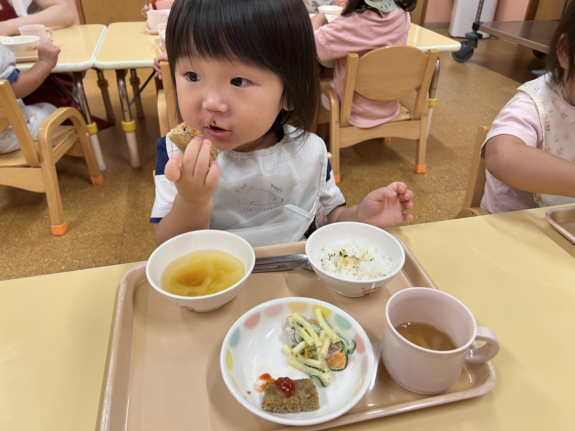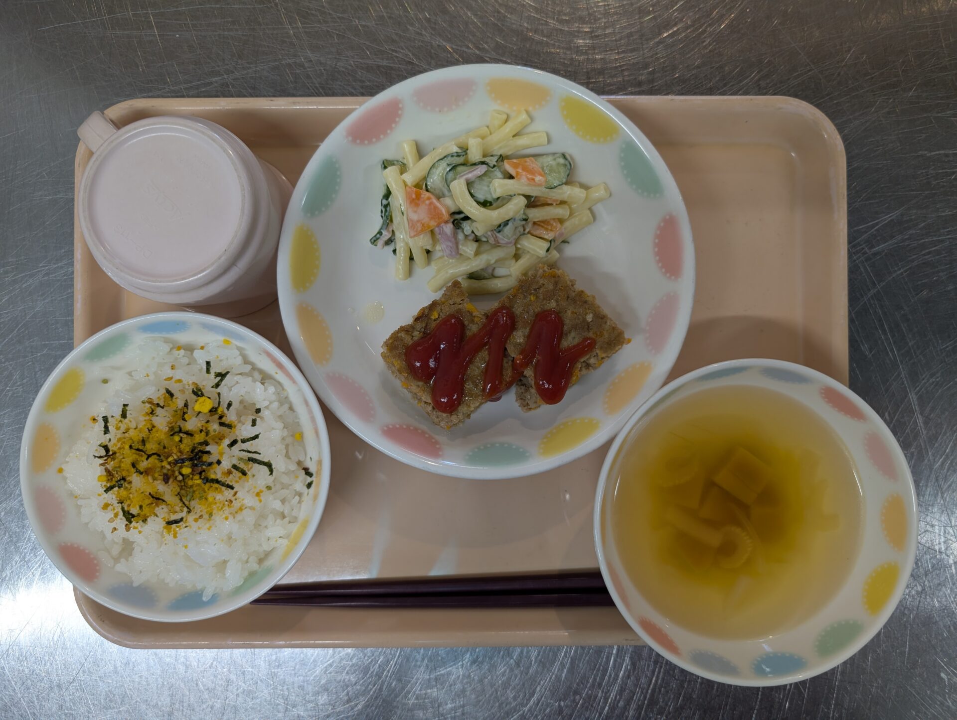 今日の給食は、ふりかけごはん、ミートローフ、マカロニサラダ、コンソメスープです😊