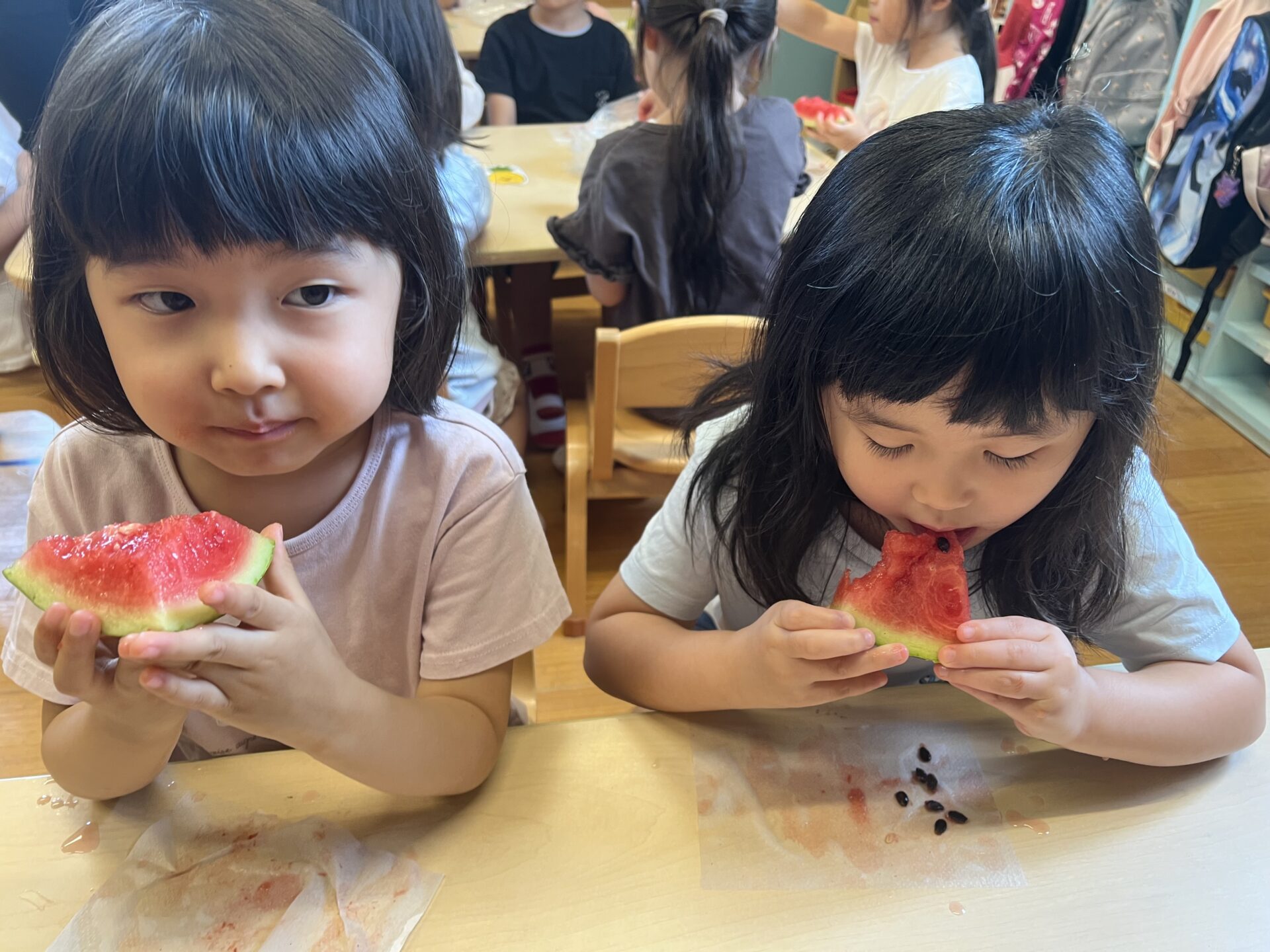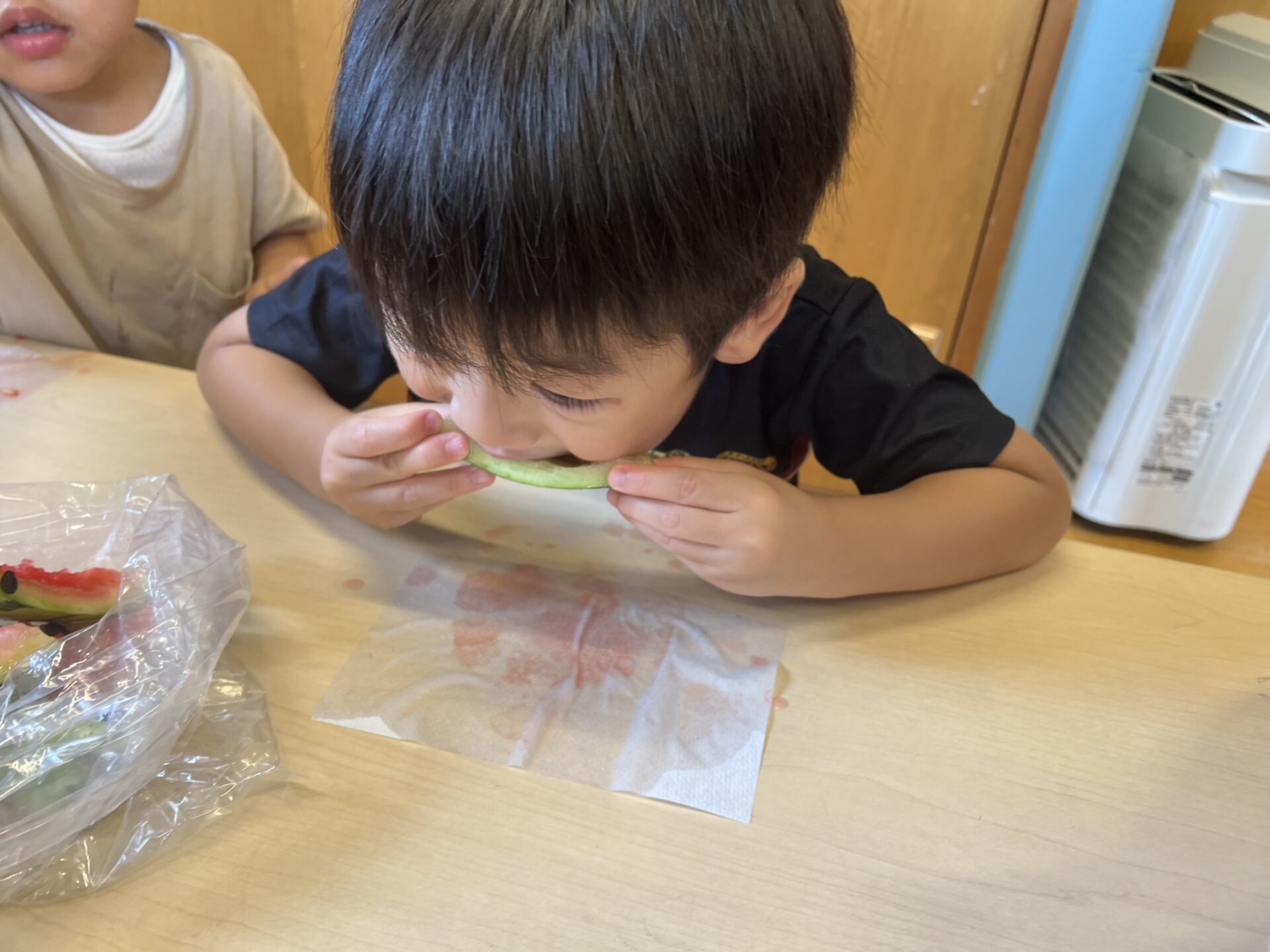 そらチームのTくんは、赤い所🍉が見えなくなるまで、綺麗に食べていました😄