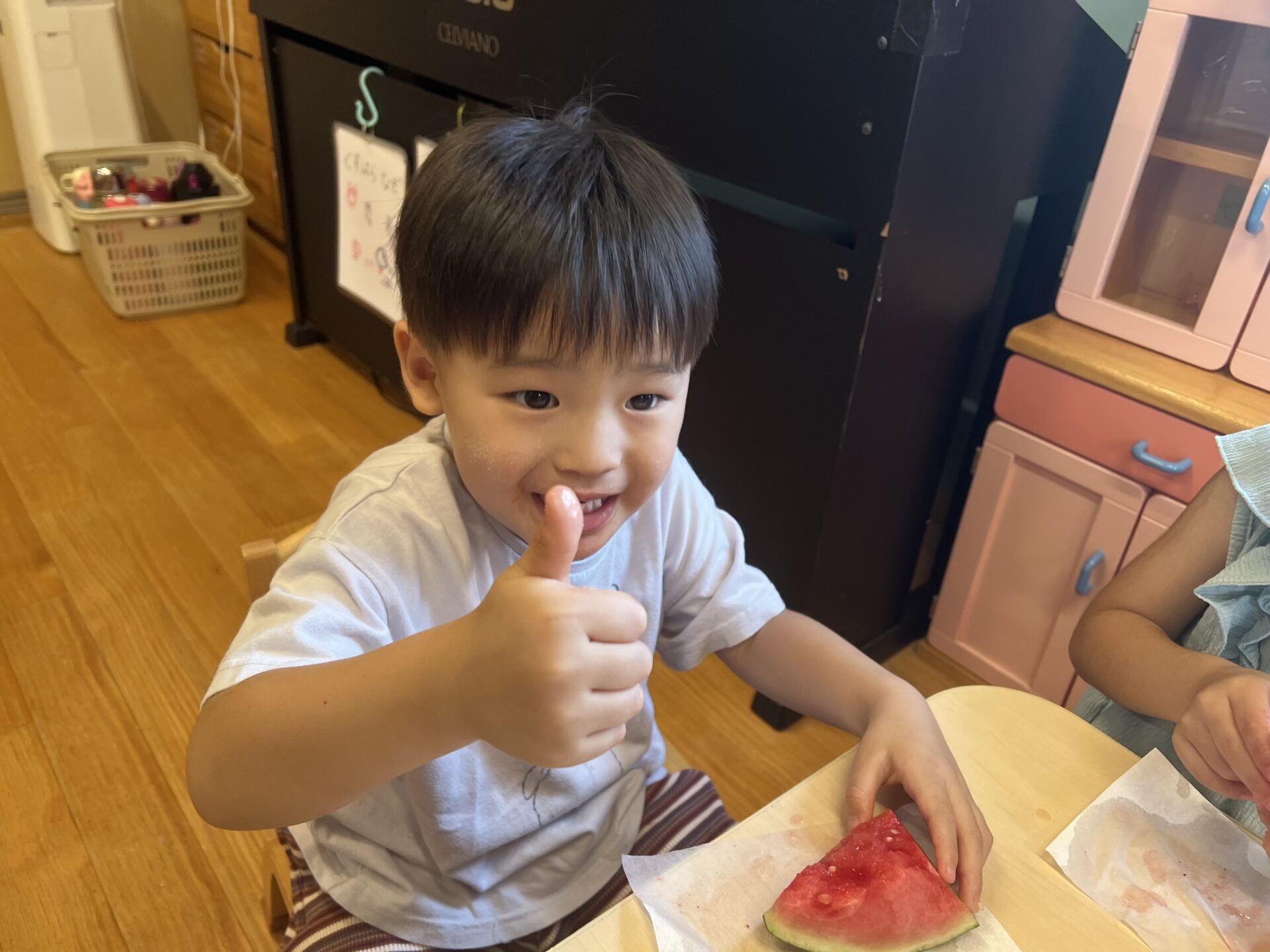 給食の前に、すいか🍉をモリモリ食べた、2歳児・あめチームのRくん😊担任の話によると、すいかが割れた瞬間、ものすごい勢いですいかを棒で叩いたとか!?Rくんらしいです😁(笑)