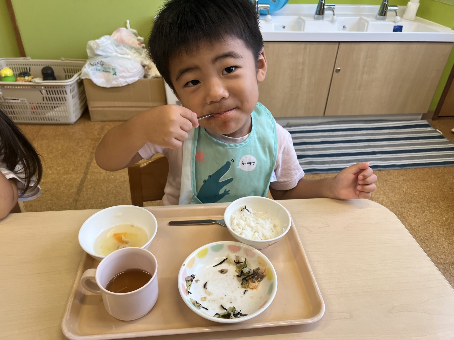 3歳児・にじチームのTくんに、「美味しいですか?」と聞くと、👍✨のポーズ。