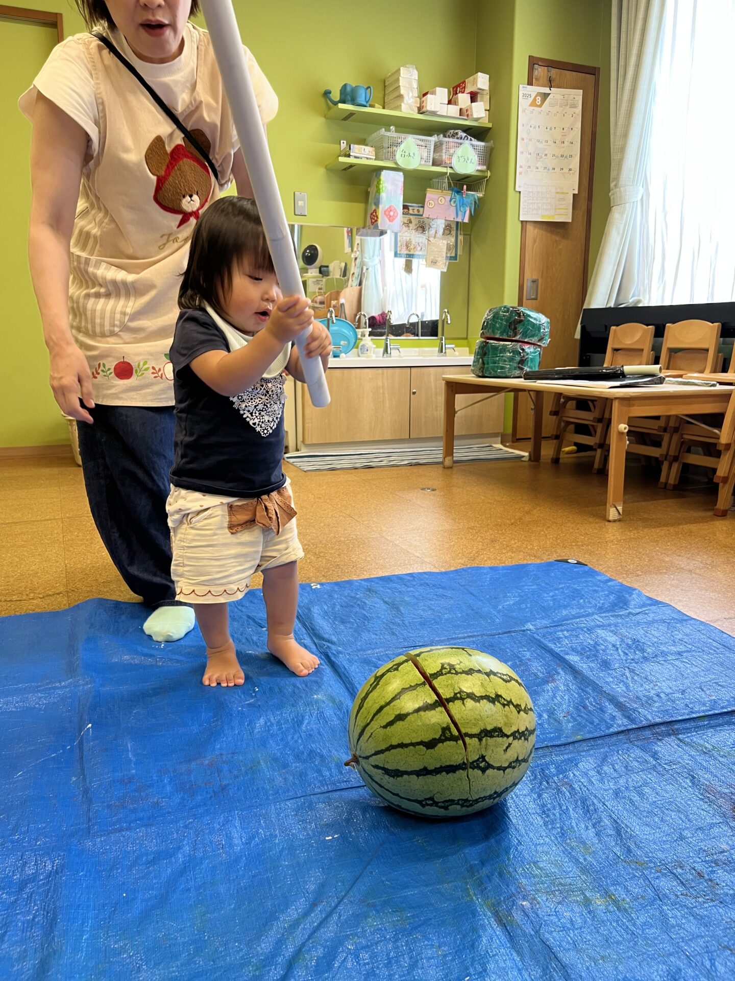 1歳児・だいちチームのYちゃんは、棒を両手でしっかり持って、すいか🍉を「えいっ!」とても上手です😊