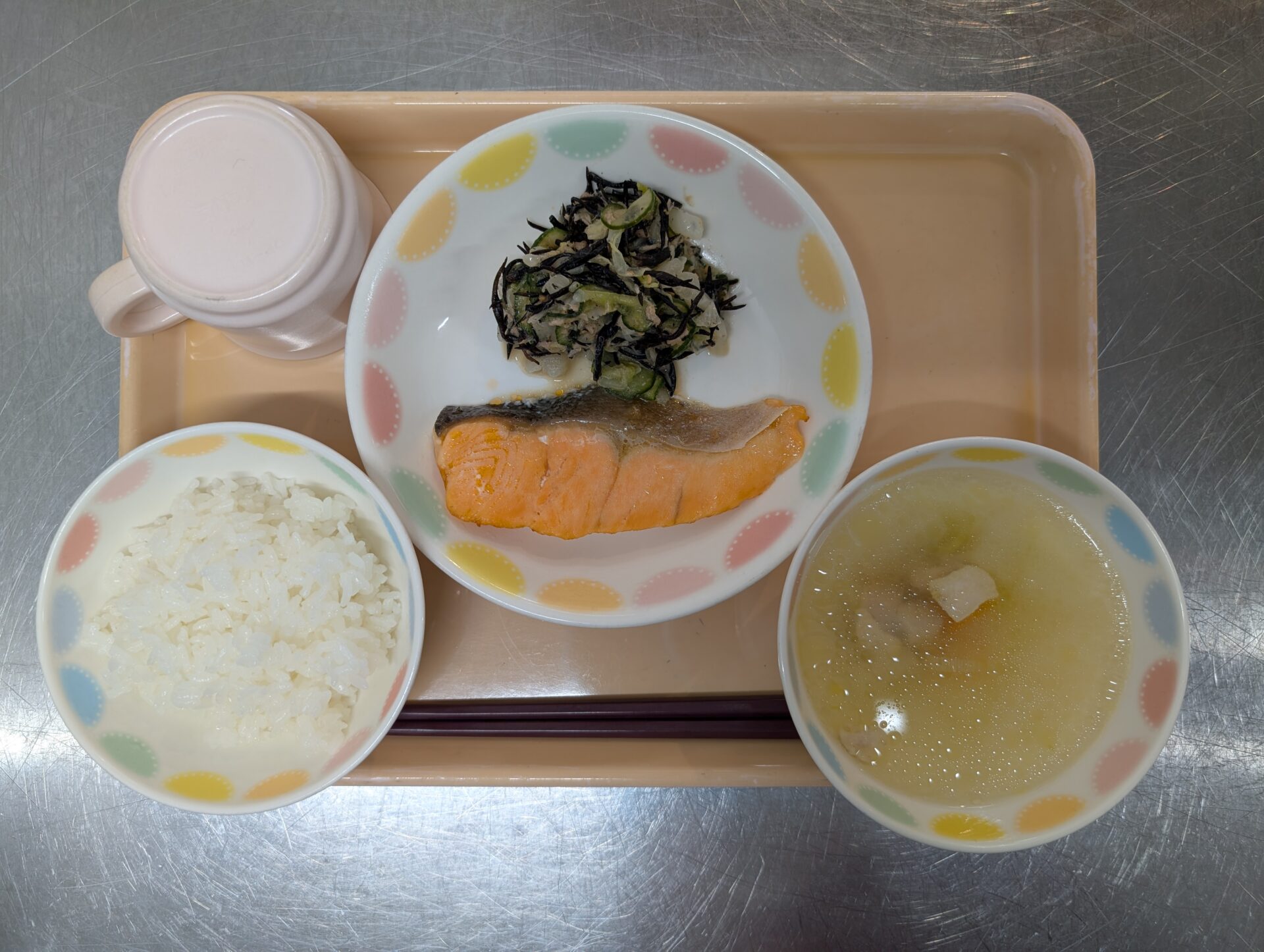 今日のメニューは、ご飯、鮭の塩焼き、ひじきのサラダ、冬瓜と鶏肉のスープです。