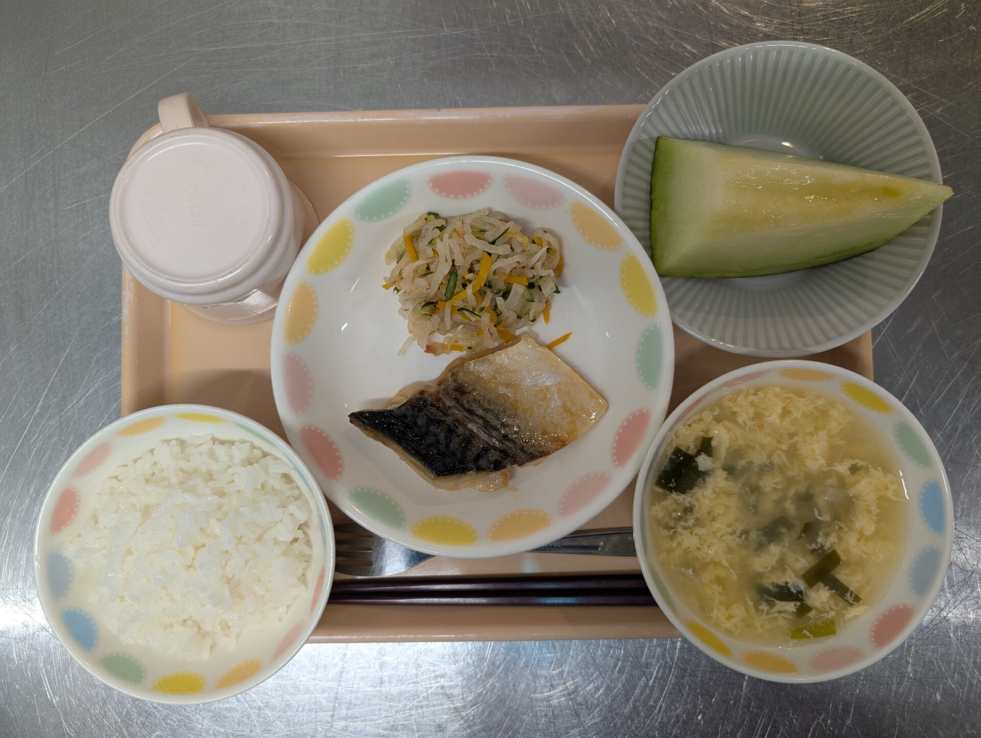今日の給食メニューは、ご飯、さばの味噌煮、大根のおかかサラダ、にら玉スープ、メロンです😊