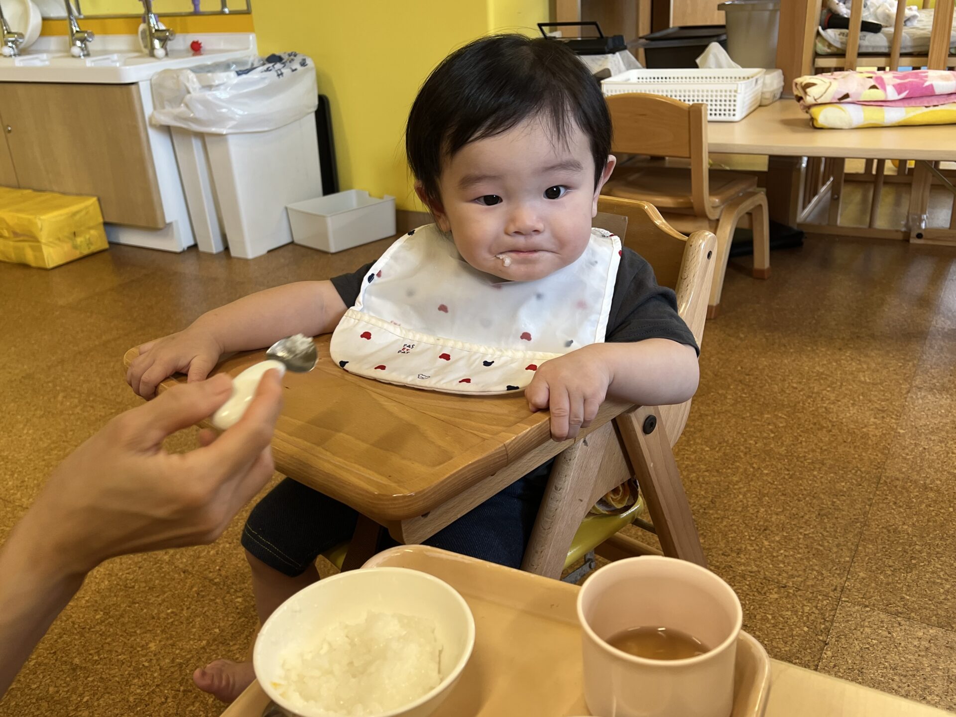 0歳児・うみチームのKくんも、今月で1歳になりました👑初めての誕生会に、きょとんとしながらも、しっかり参加できていました。もうすぐ完了食に移行です😊
