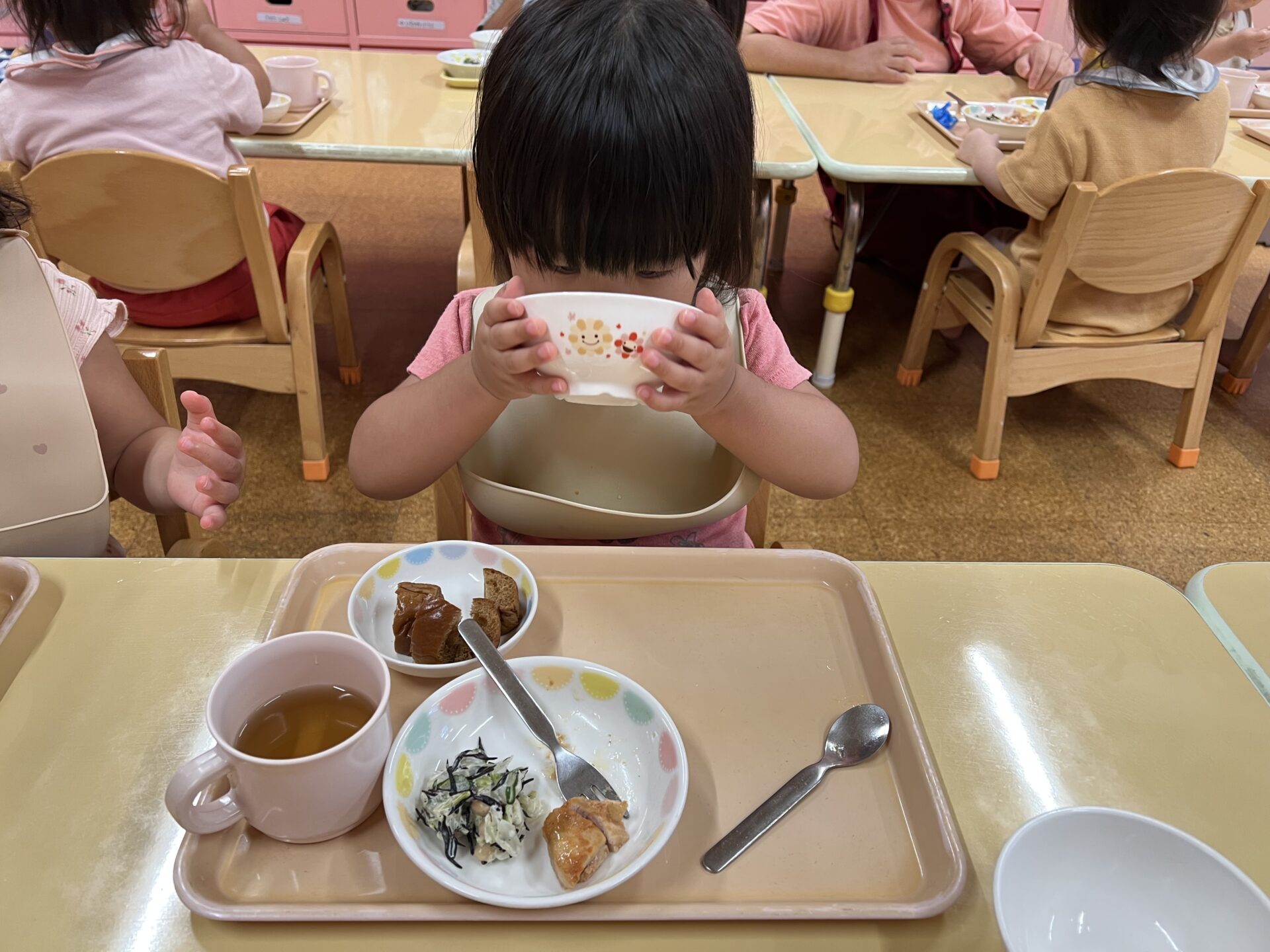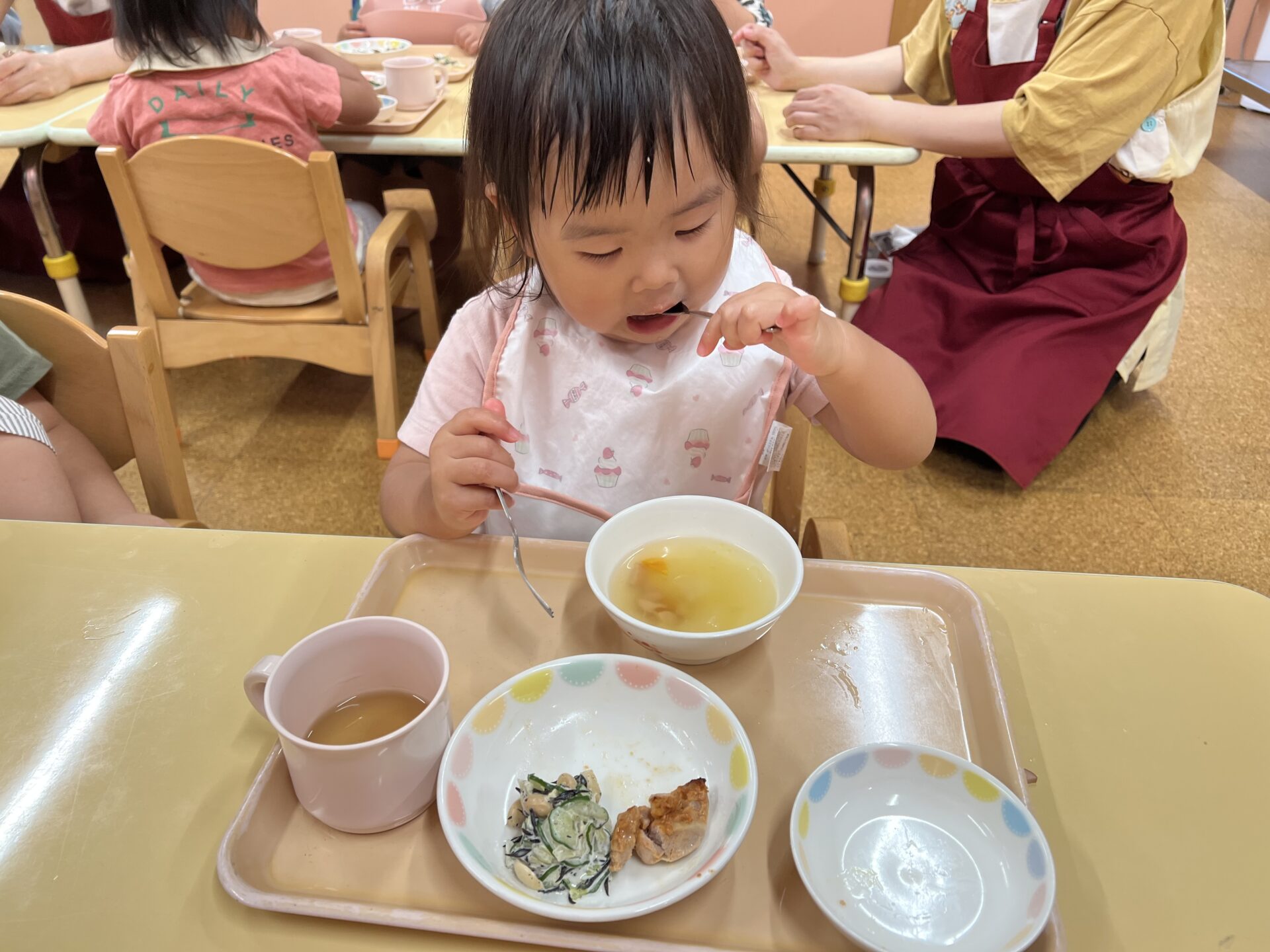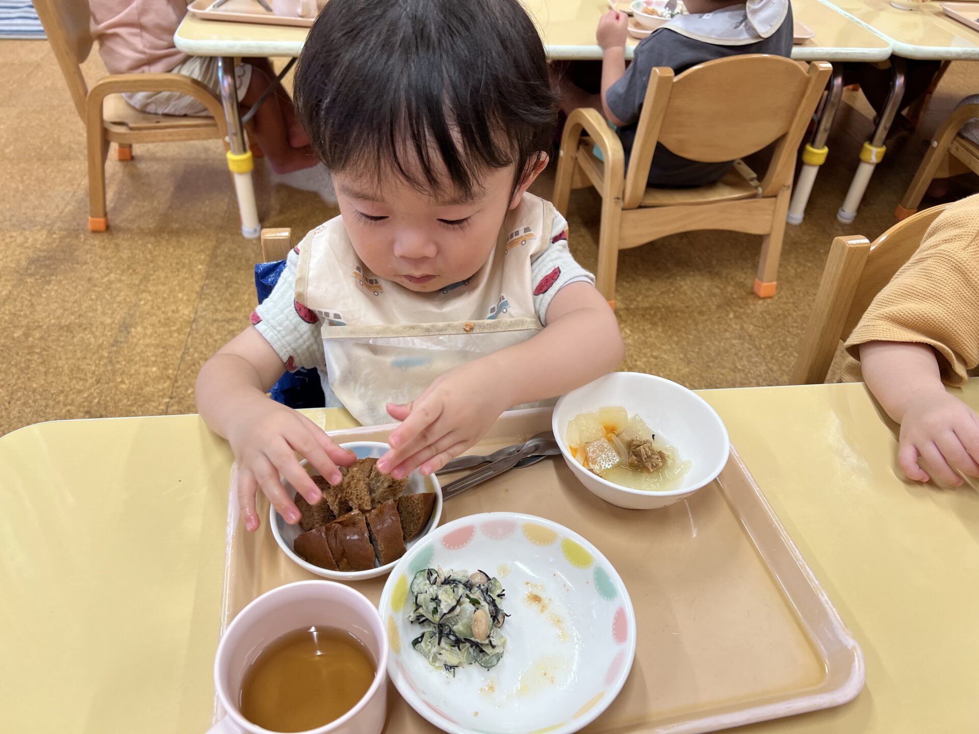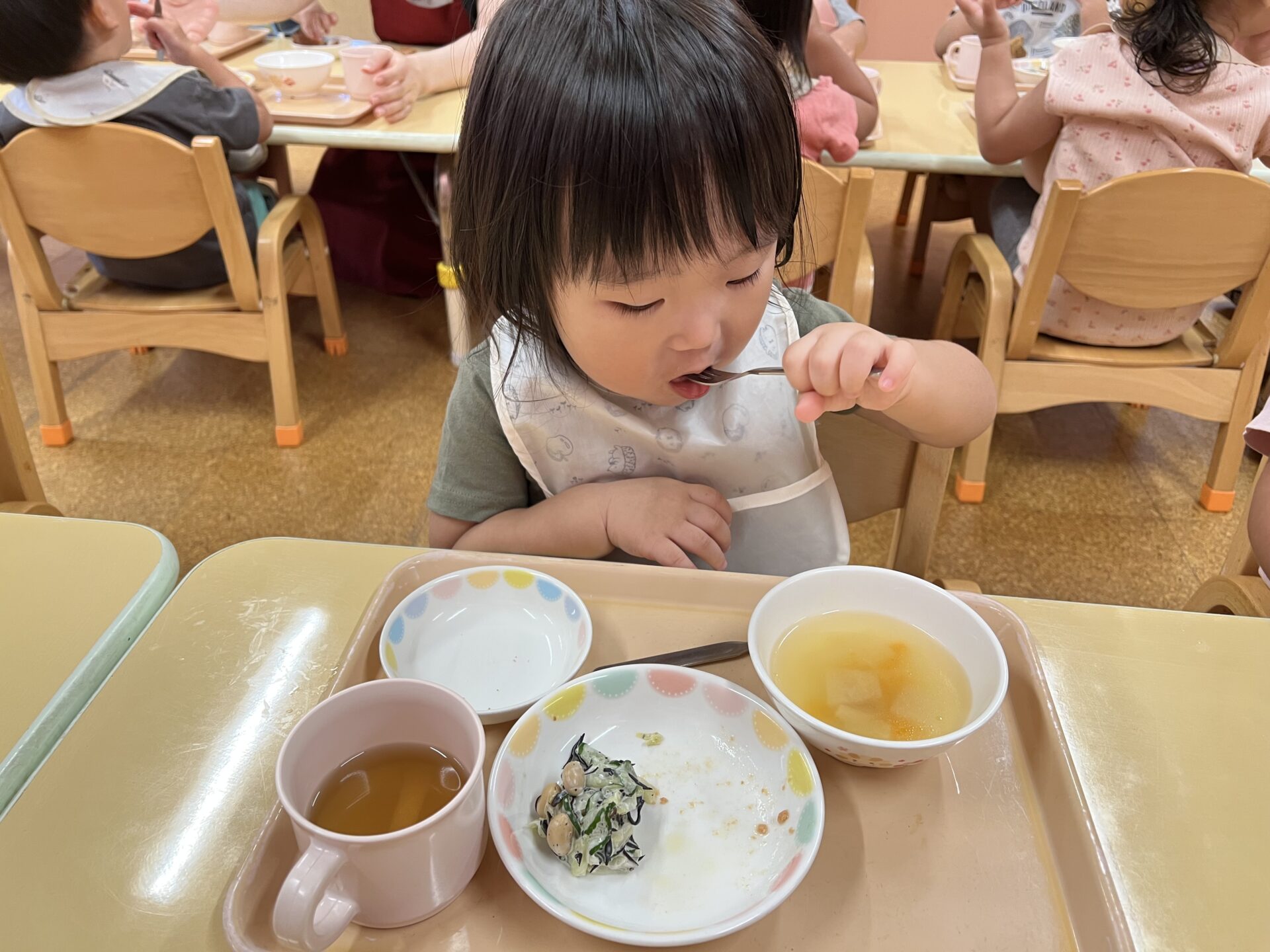 1歳児・だいちチームの給食の時間を覗いてみると…おもしろいもので、好き物を真っ先に食べる子が多いのに気がつきました😄