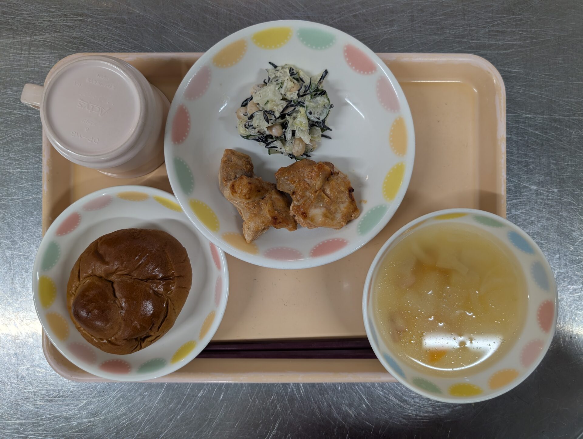 今日のメニューは、黒糖ロール、タンドリーチキン、ひじきと大豆のサラダ、とうがんのスープです😊