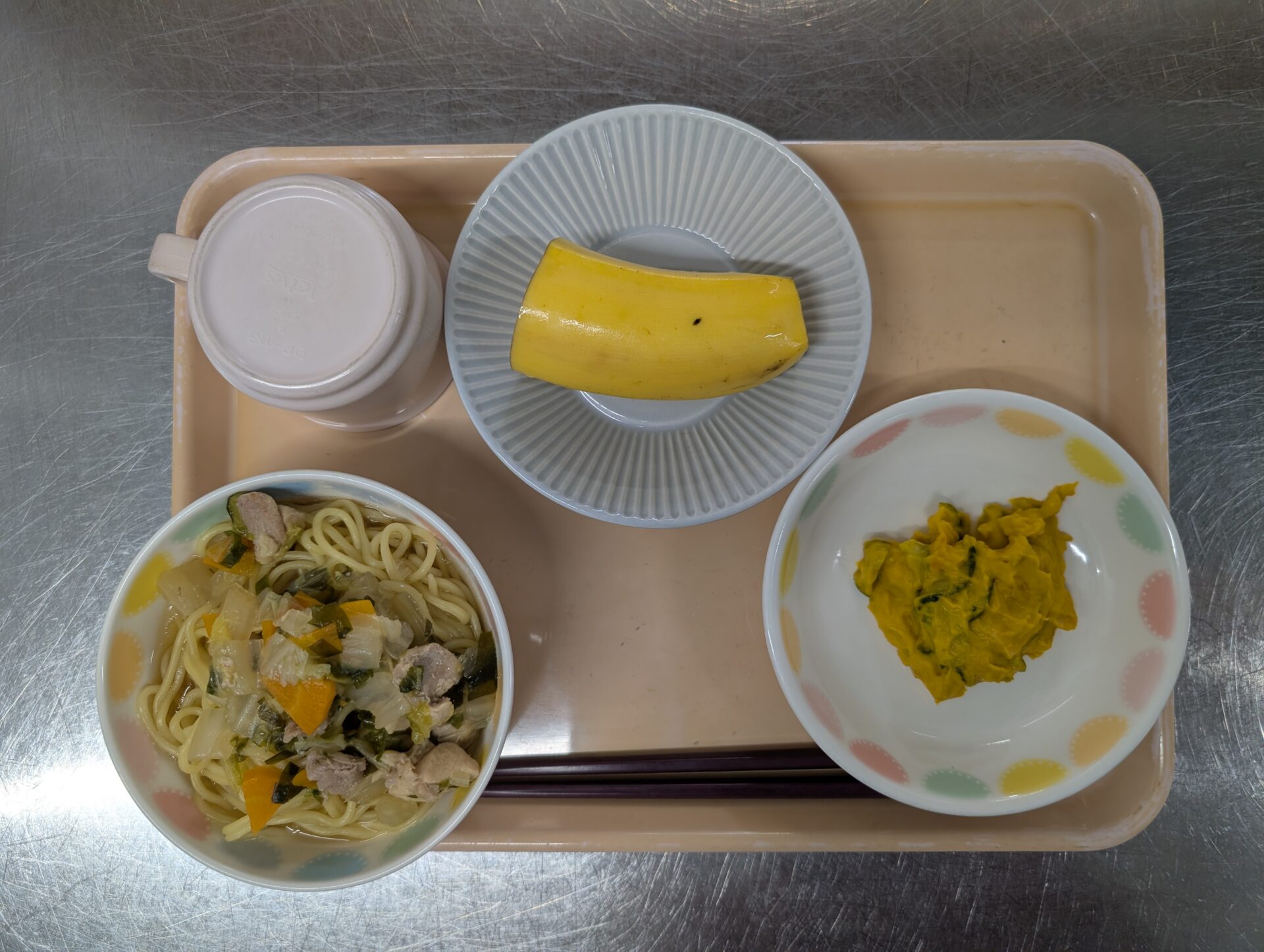 今日の給食は、五目ラーメン、かぼちゃのサラダ、バナナです😊