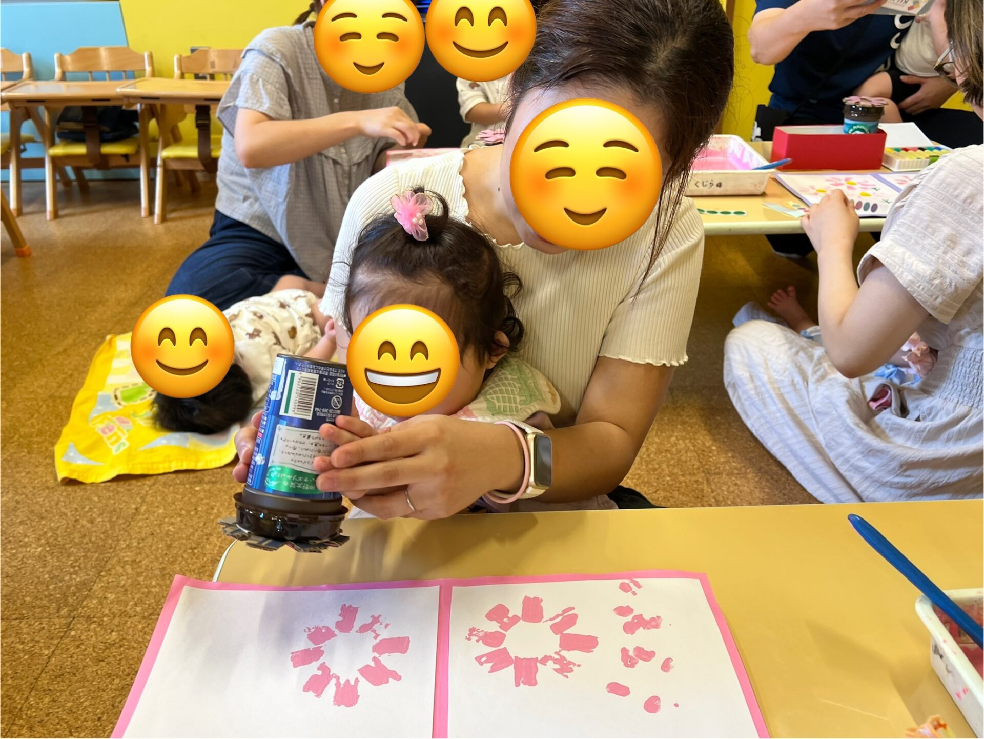 4歳児・そらチームのNちゃんの妹も参加😊Nちゃんに、「明日、絵の具するんだよ!」と言うと、「えー😳でも、絵の具たれるんじゃない💦」と絵の具の心配をしていたNちゃんでした(笑)