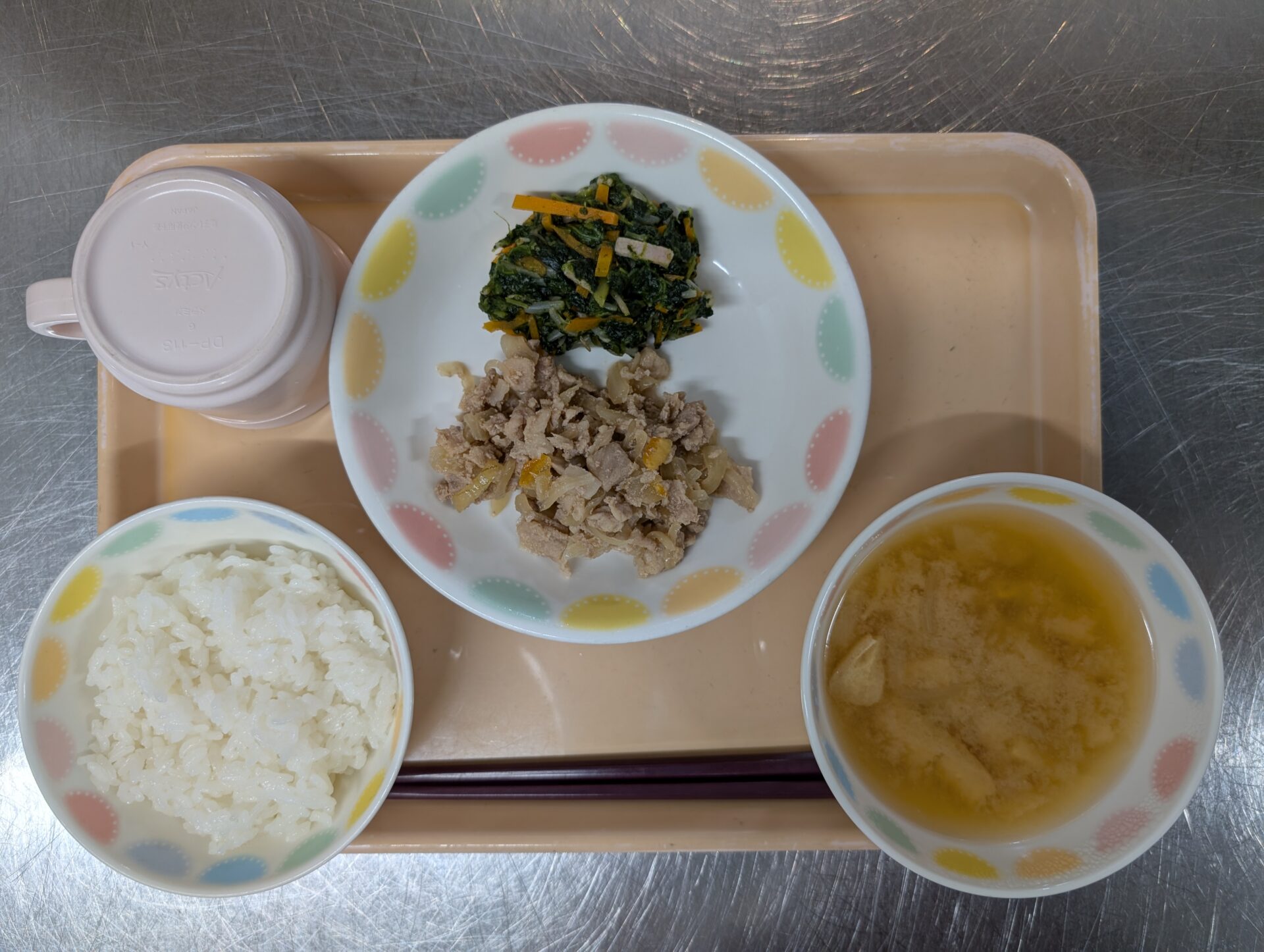 今日の給食は、ご飯、豚肉のマーマレード炒め、千草和え、じゃが芋の味噌汁です😊