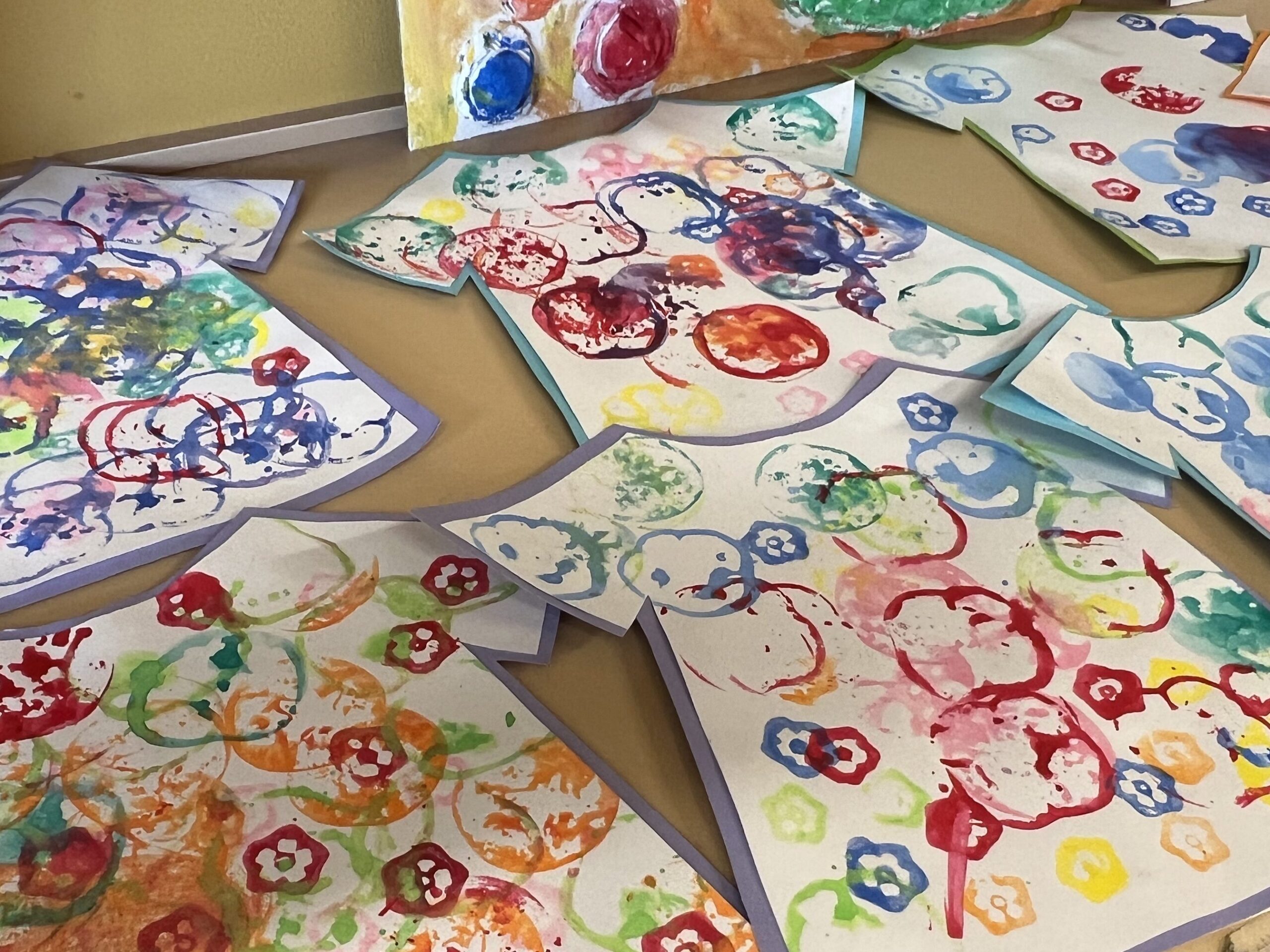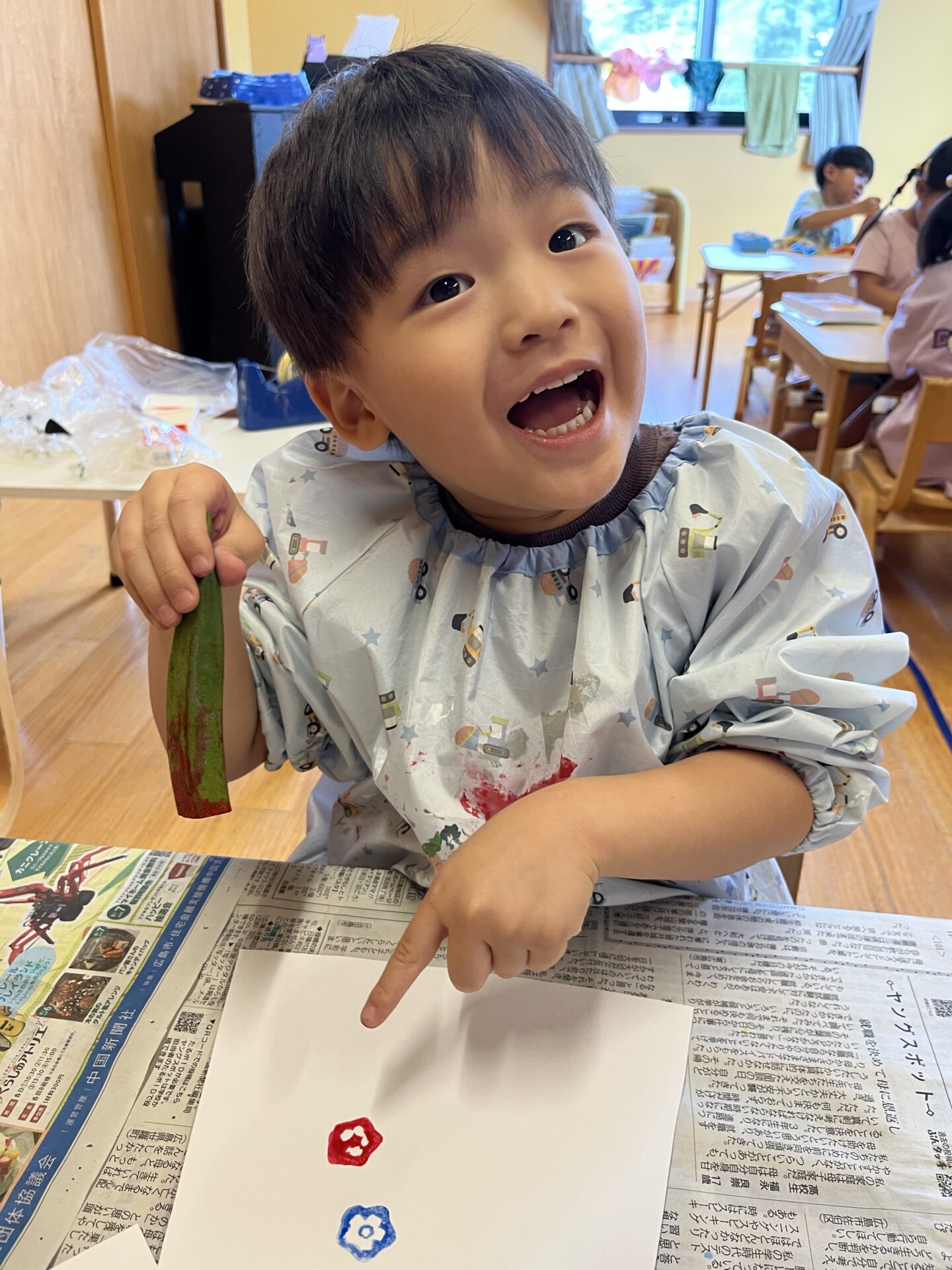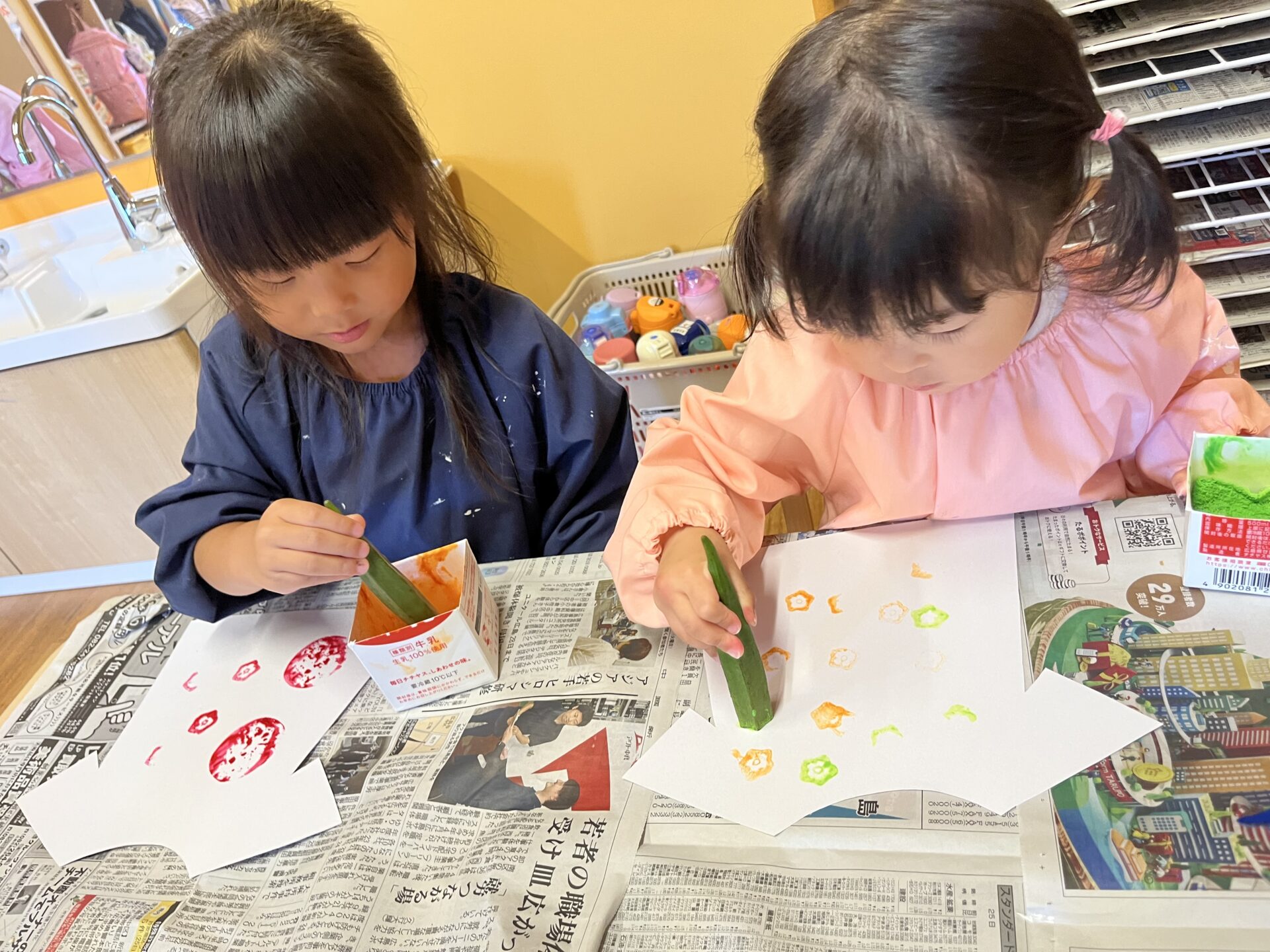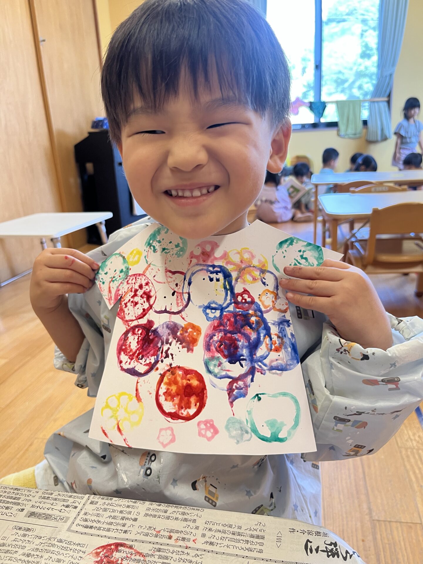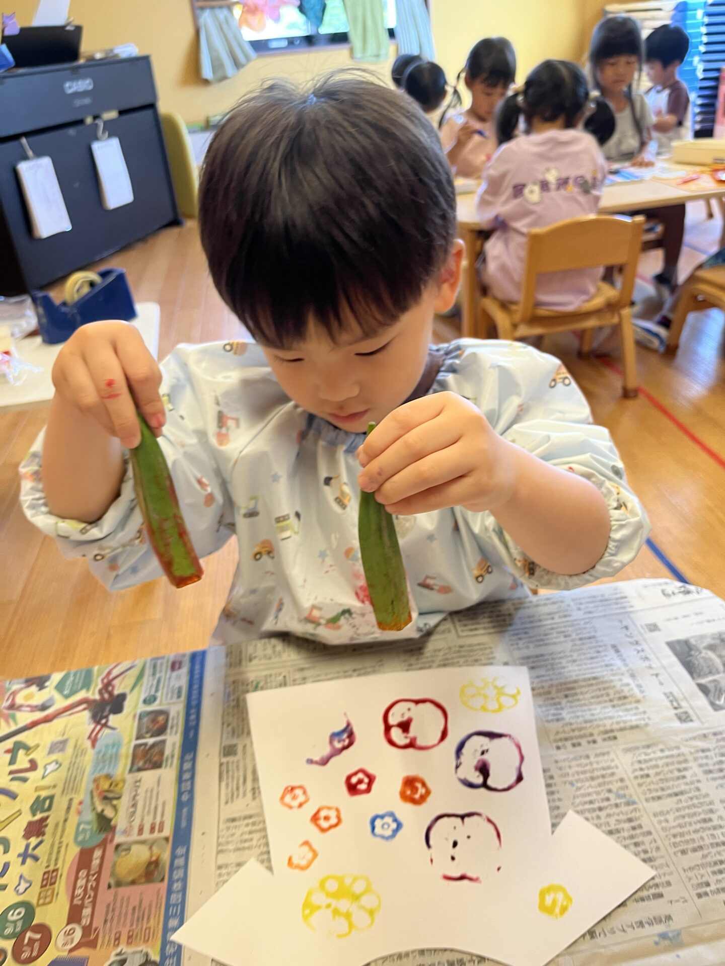 3歳児・にじチームさんが、野菜スタンプをして遊んでいました😊
