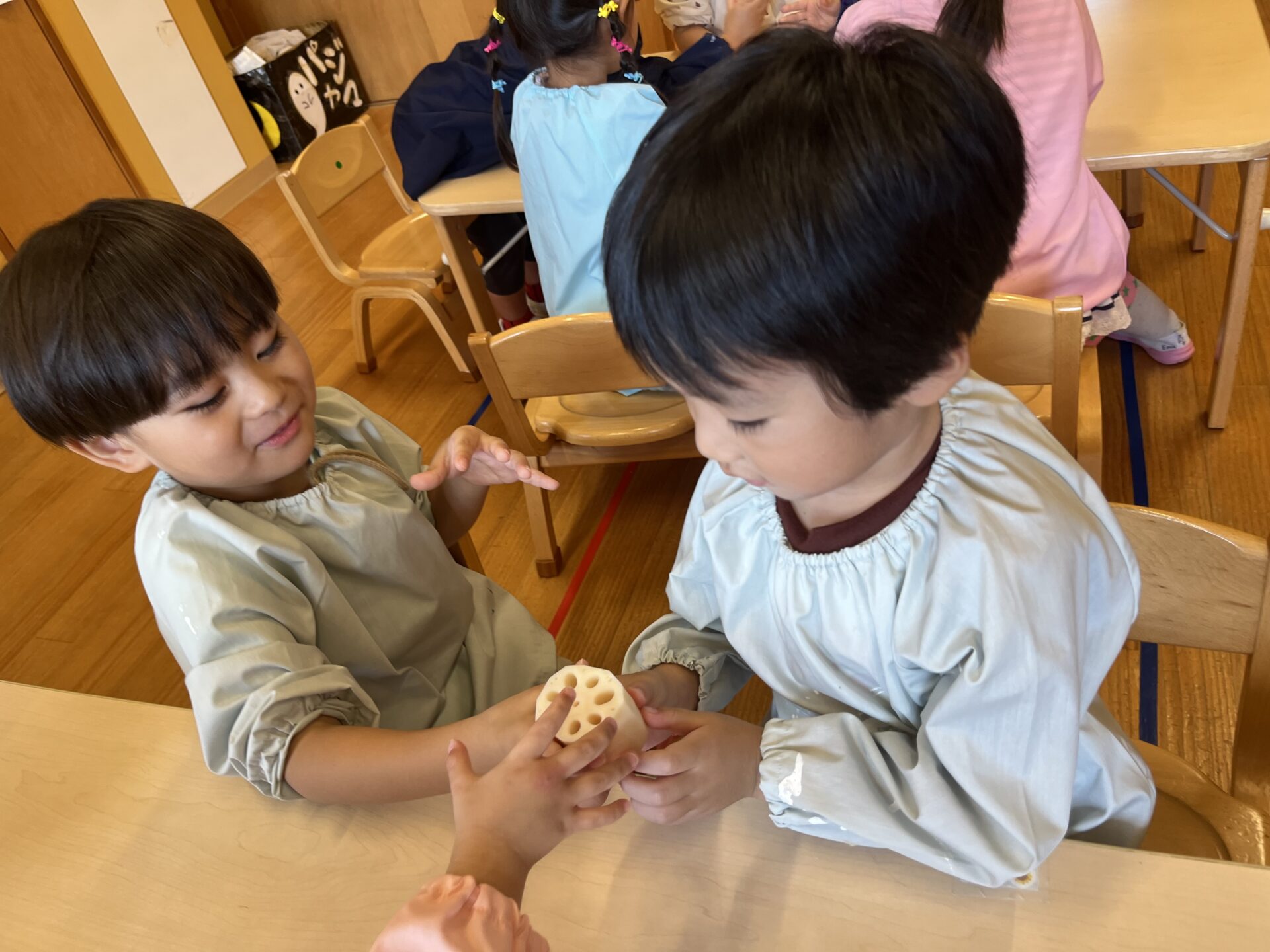 まずは、みんなで野菜を観察✨れんこんには、穴がたくさんあいています😊