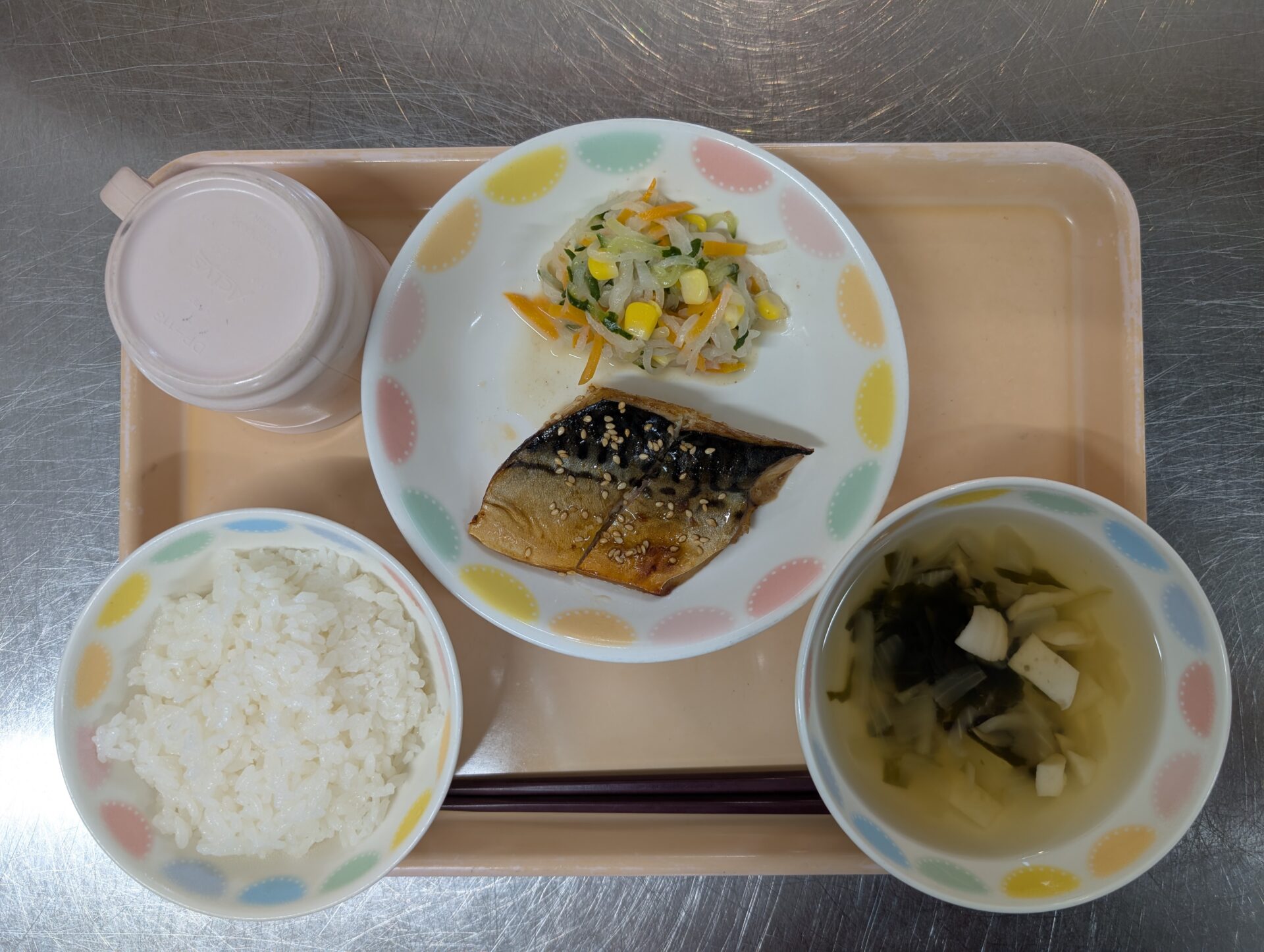 今日の給食は、ご飯、さばのみりん漬け、大根サラダ、はんぺんのすまし汁です。