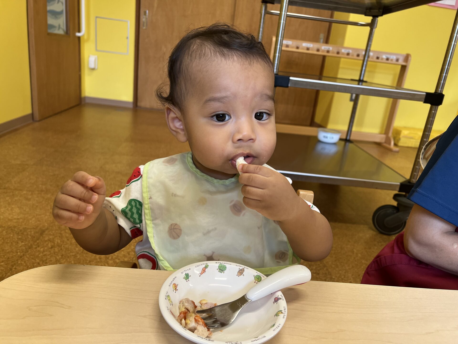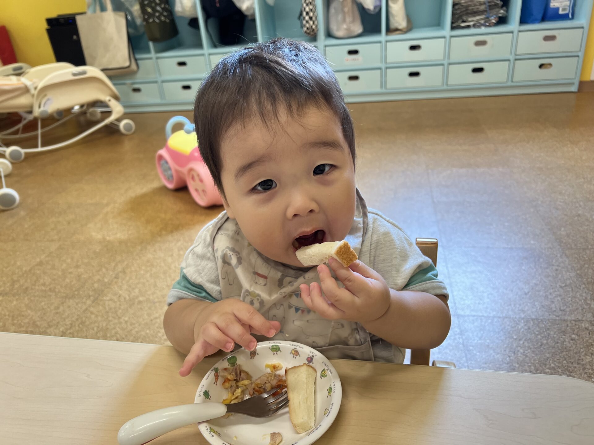 0歳児・うみチームさんは、全員出席😊完了食のIくんは、美味しそうに食パンを食べていました。上手にお皿をくるっと回して、取りやすいように工夫していたのには驚きです✨