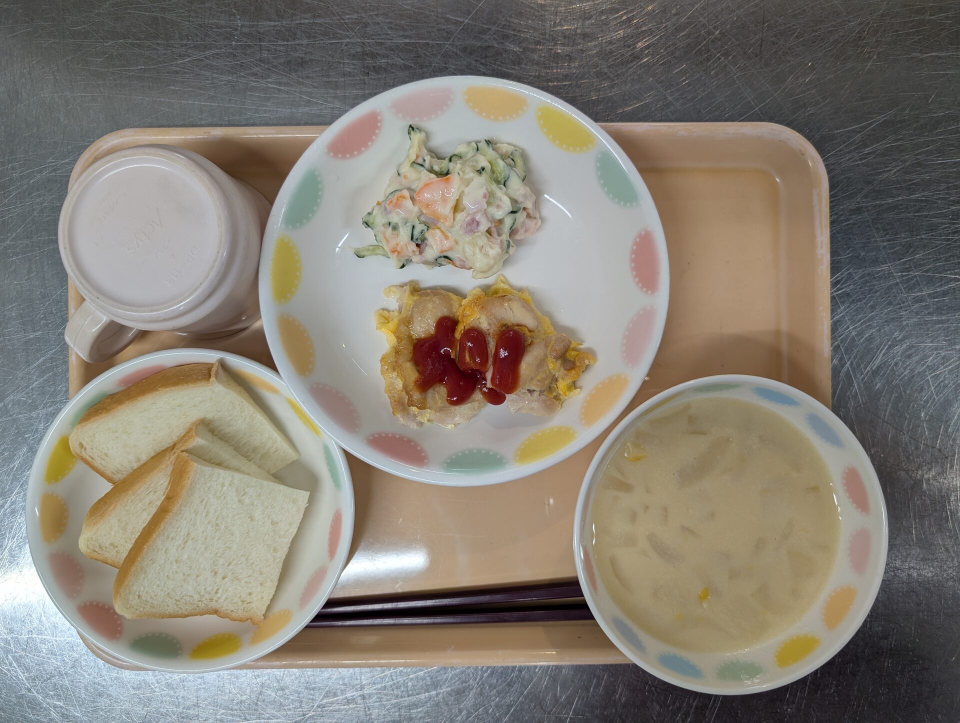 今日のメニューは、食パン、鶏肉のピカタ、ポテトサラダ、コーンスープ😊