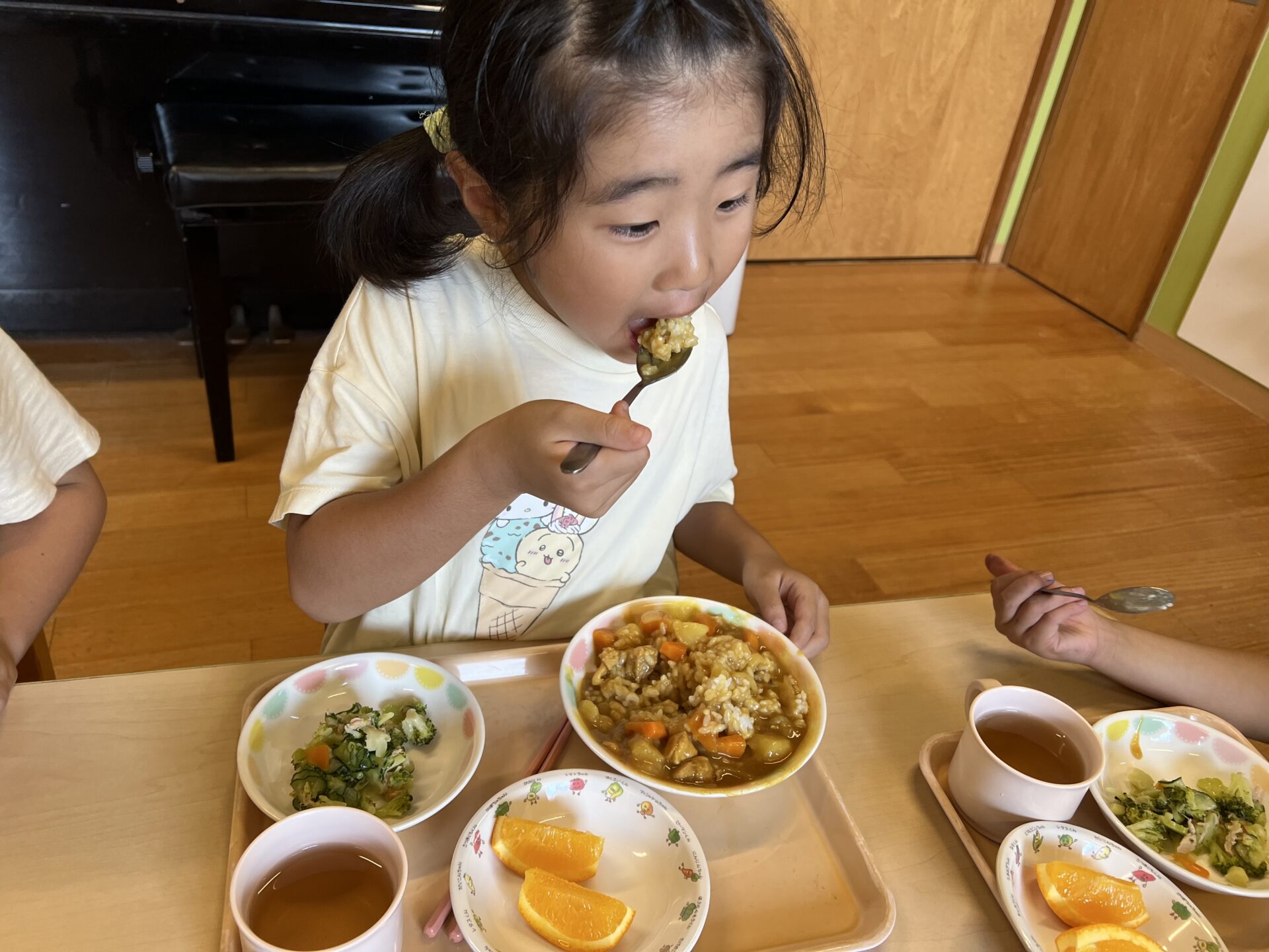 5歳児・くじらチームさんは、みんなお皿からこぼれそうなぐらい、大盛チキンカレーを食べていましたよ😊