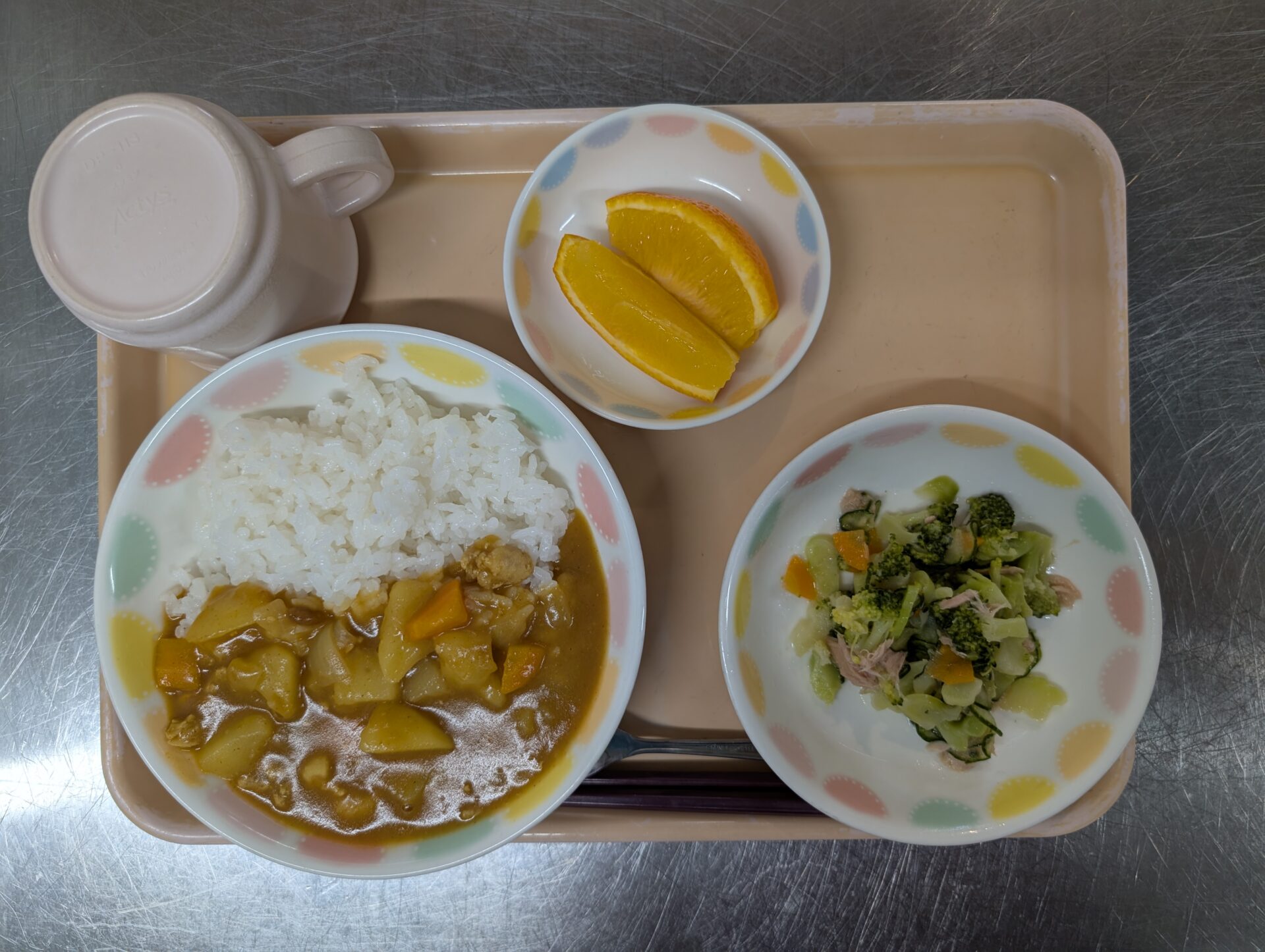 連休明けの給食は、チキンカレー、ブロッコリーのサラダ、オレンジです。