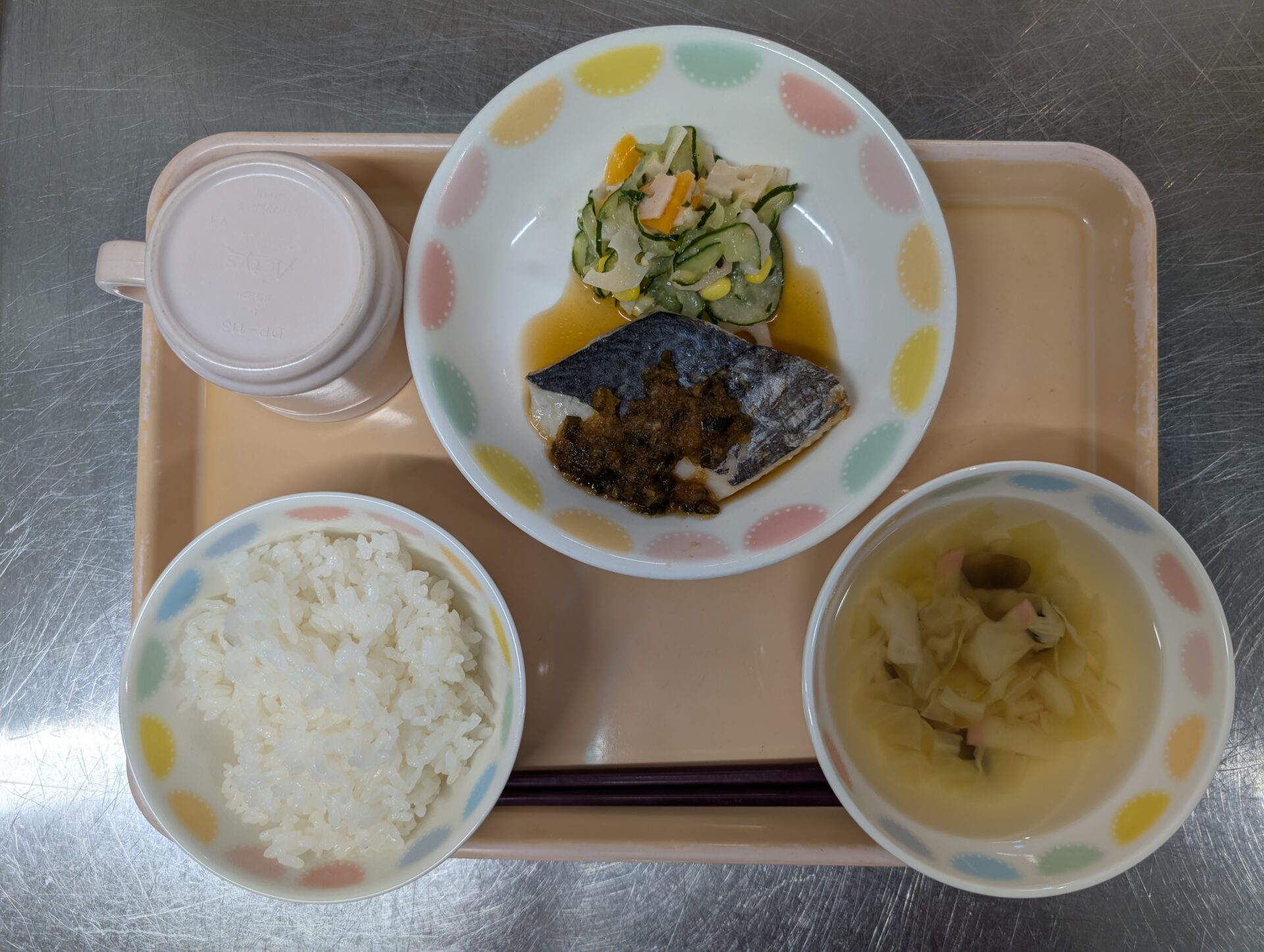 今日のメニューは、ご飯、魚のおろしソースかけ、かみかみサラダ、キャベツのすまし汁です😊