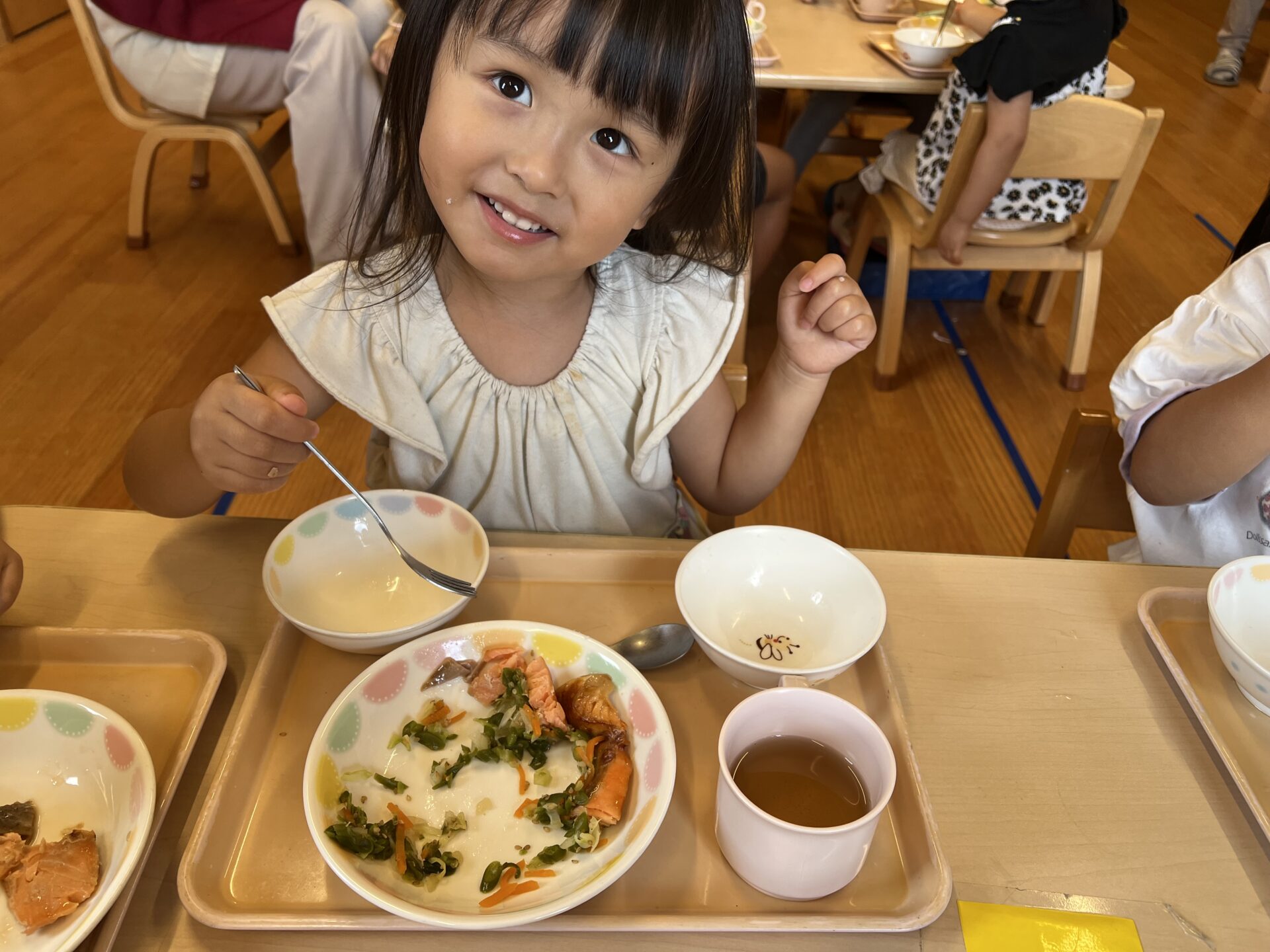 3歳児・にじチームさんは、運動会のダンスを楽しんでいました♪Kちゃんは、「ちょっとまちがえちゃった💦」とこっそり教えてくれました。