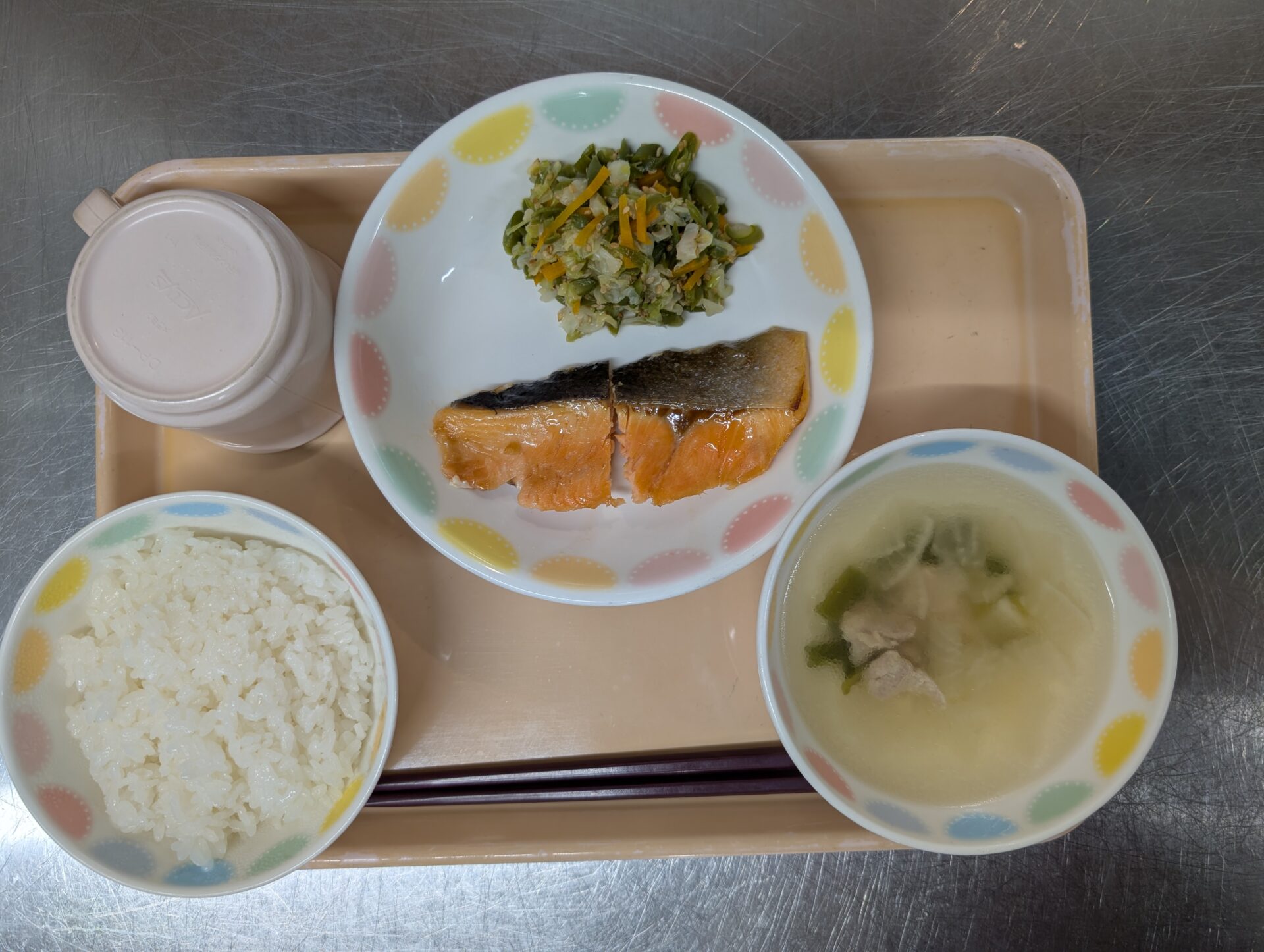 今日のメニューは、ご飯、鮭の照り焼き、キャベツのごま和え、大根とにらのスープです😊