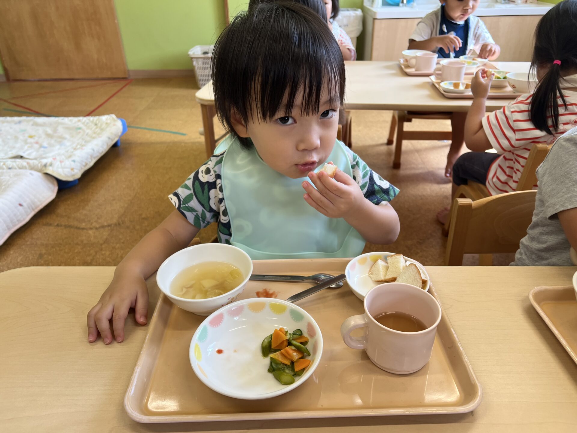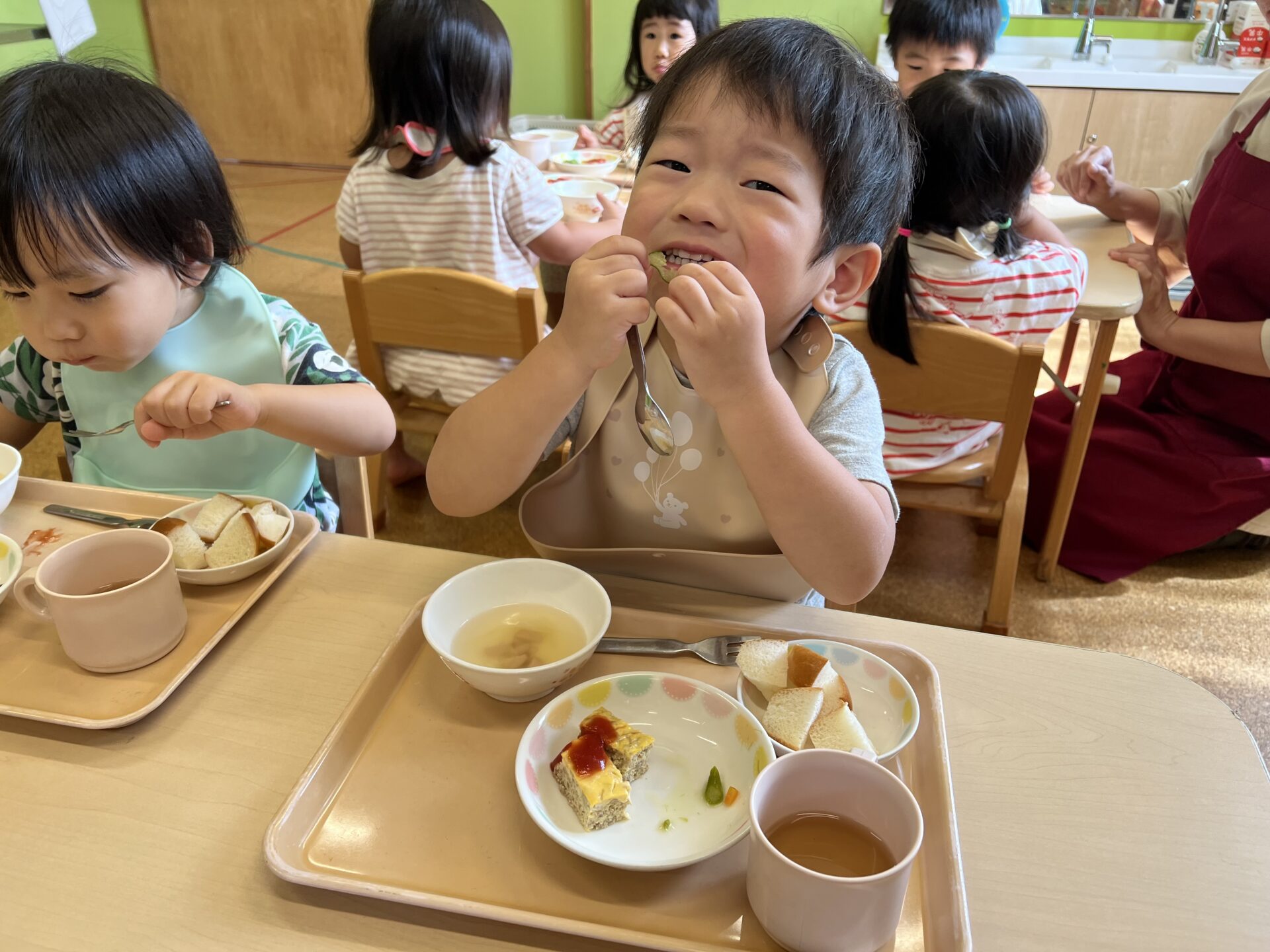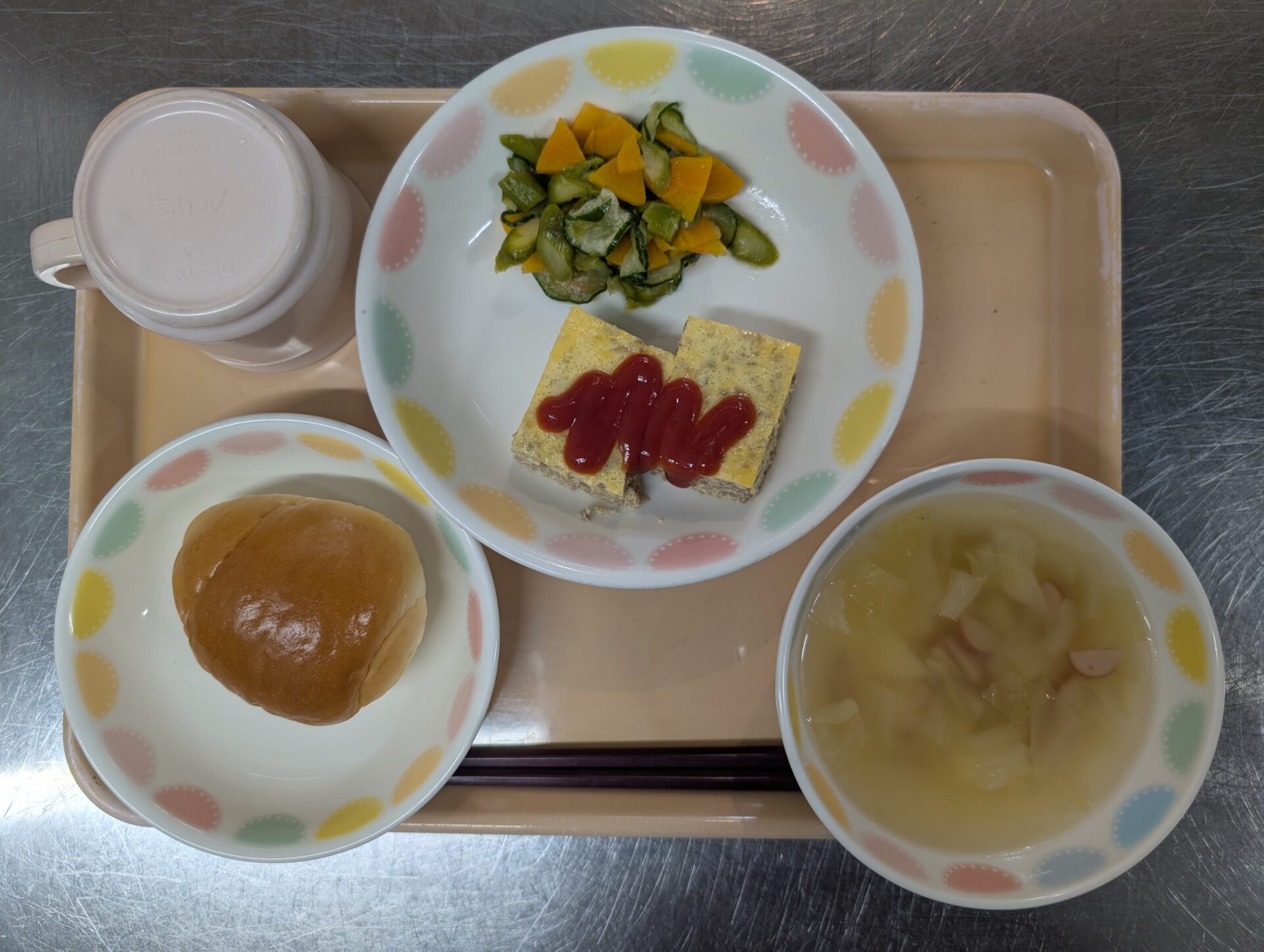 今日のメニューは、ロールパン、ミートオムレツ、マリネサラダ、ポトフ風スープです😊