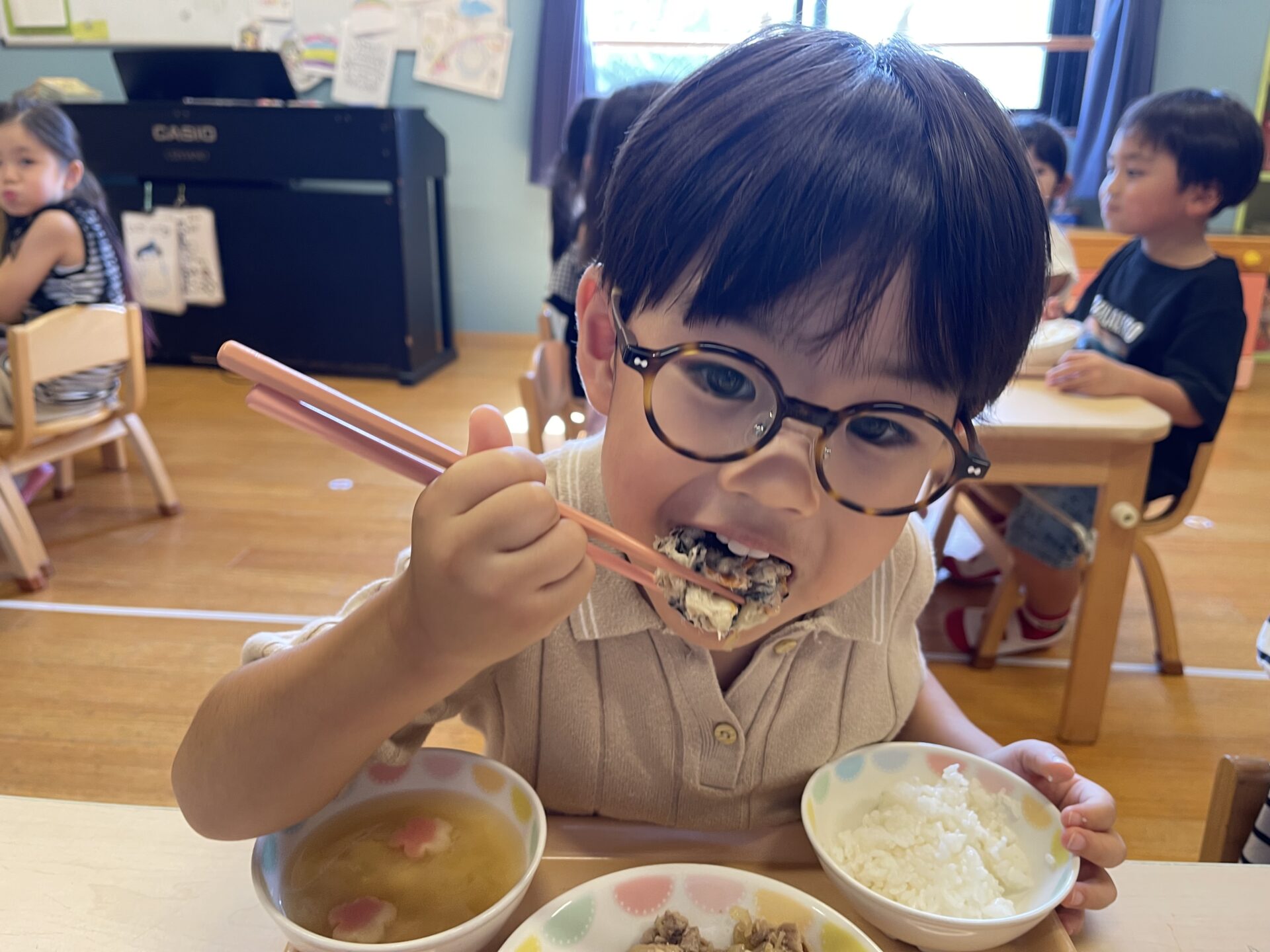 4歳児・そらチームさんは、屋上園庭でリレーの練習をしたので、お腹がペコペコだったそう😊