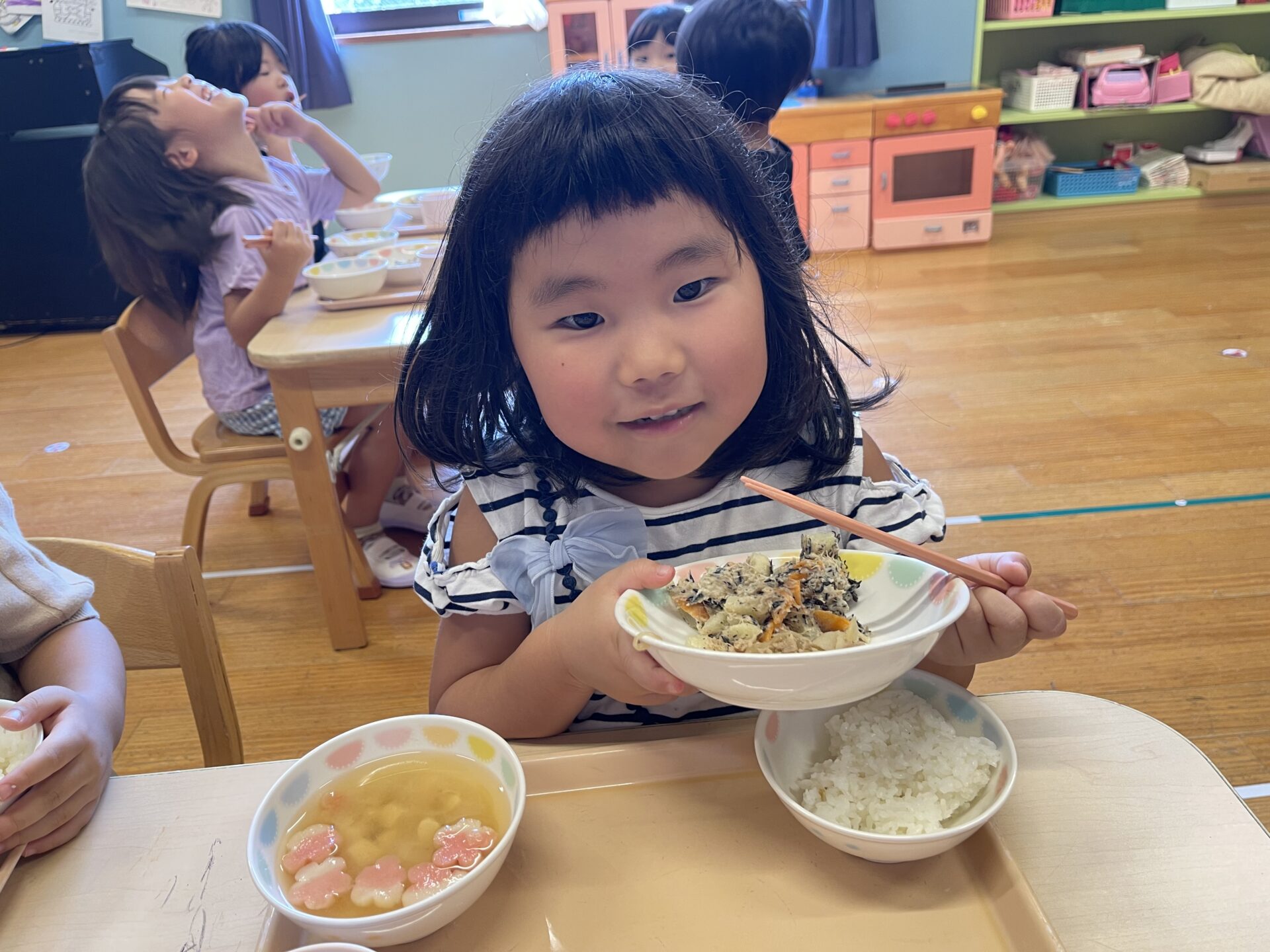 お花の形をした麩が可愛らしく、5歳児・くじらチームのAちゃんは、「4つも入ってた💗」と喜んでいました。