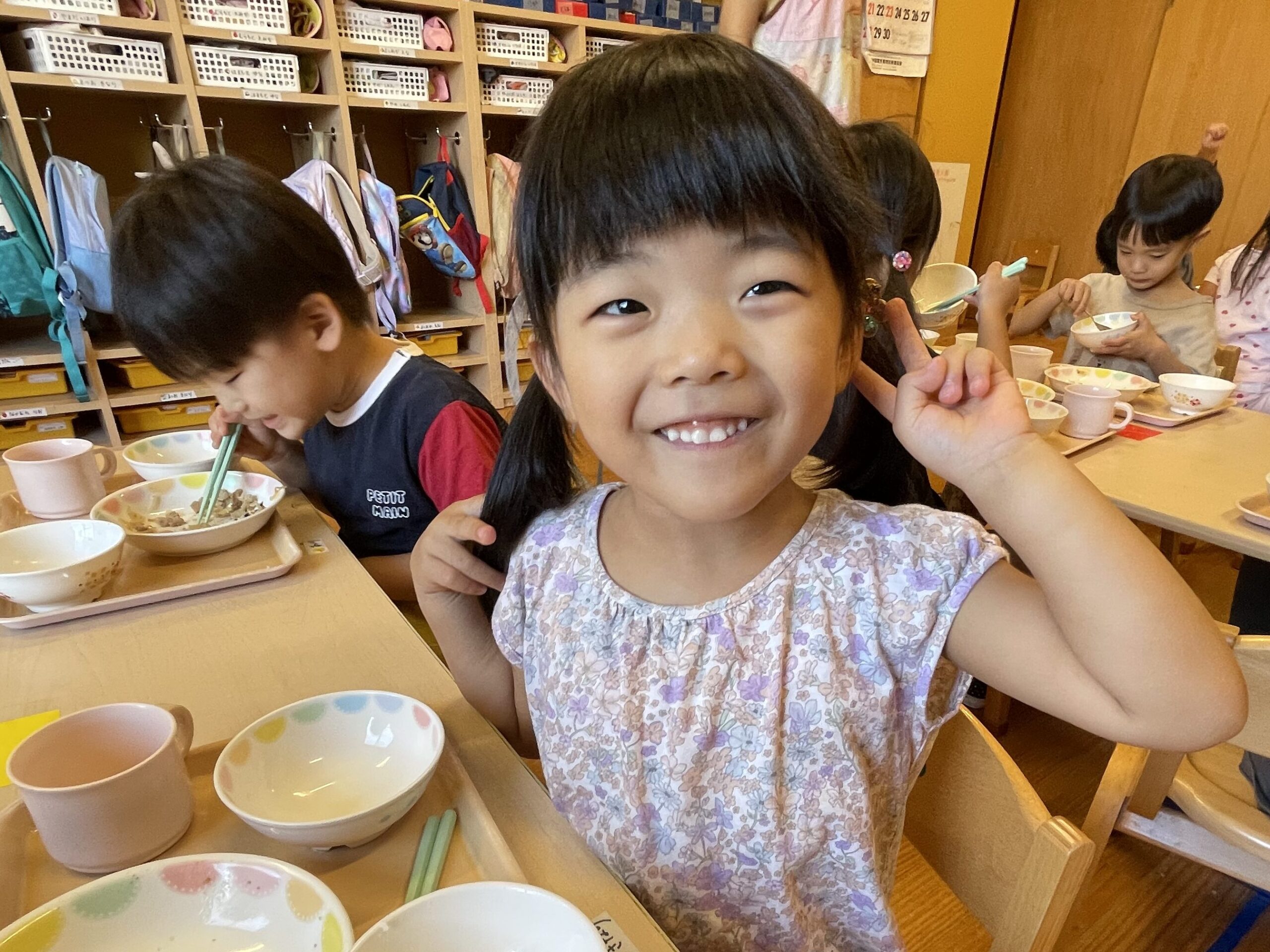 3歳児・にじチームを覗いてみると、給食を全部ピカピカ✨に完食した子がたくさんいました😊