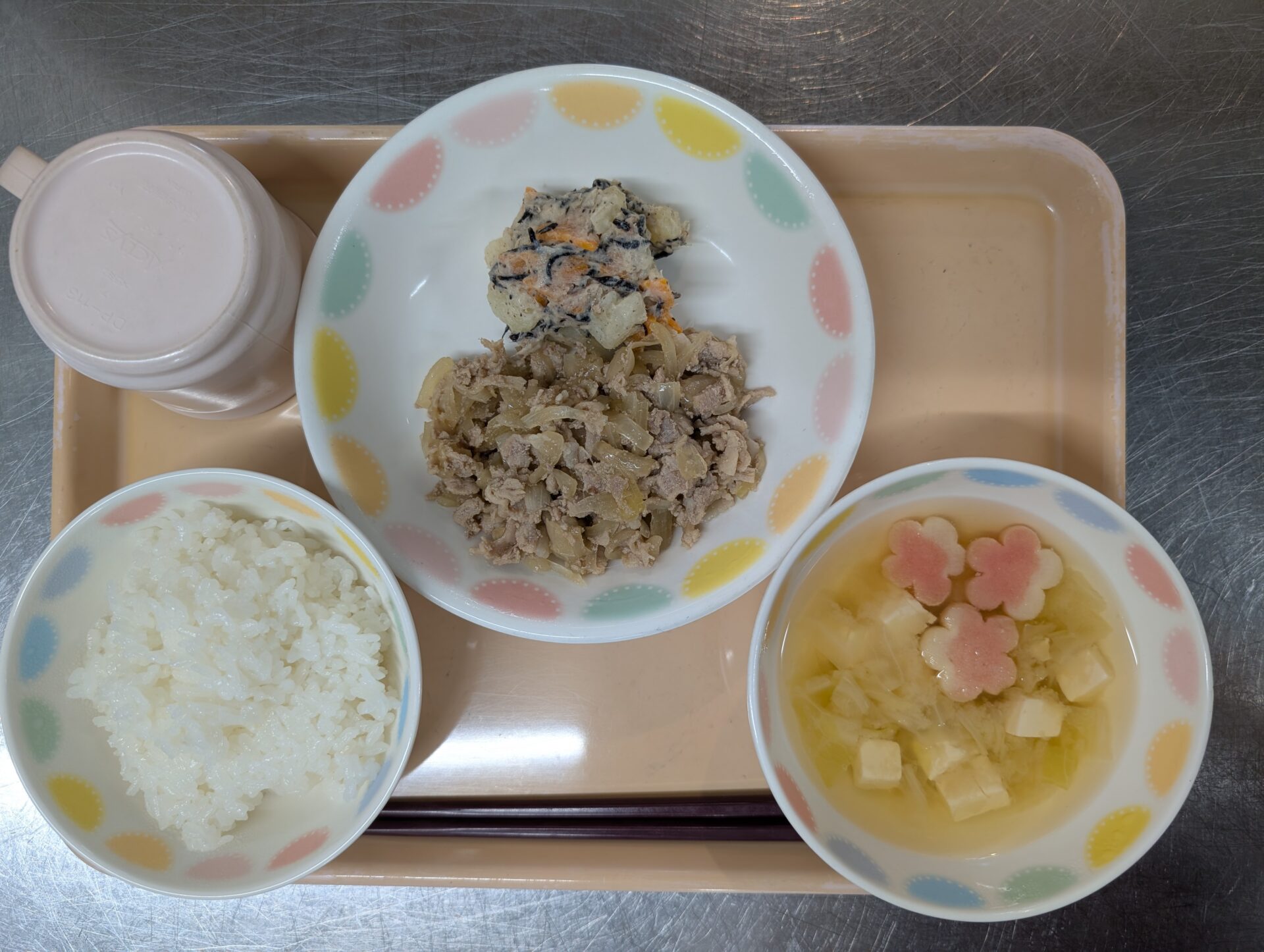 今日のメニューは、ご飯、豚のしょうが焼き、ひじきポテト、麩の味噌汁です😊