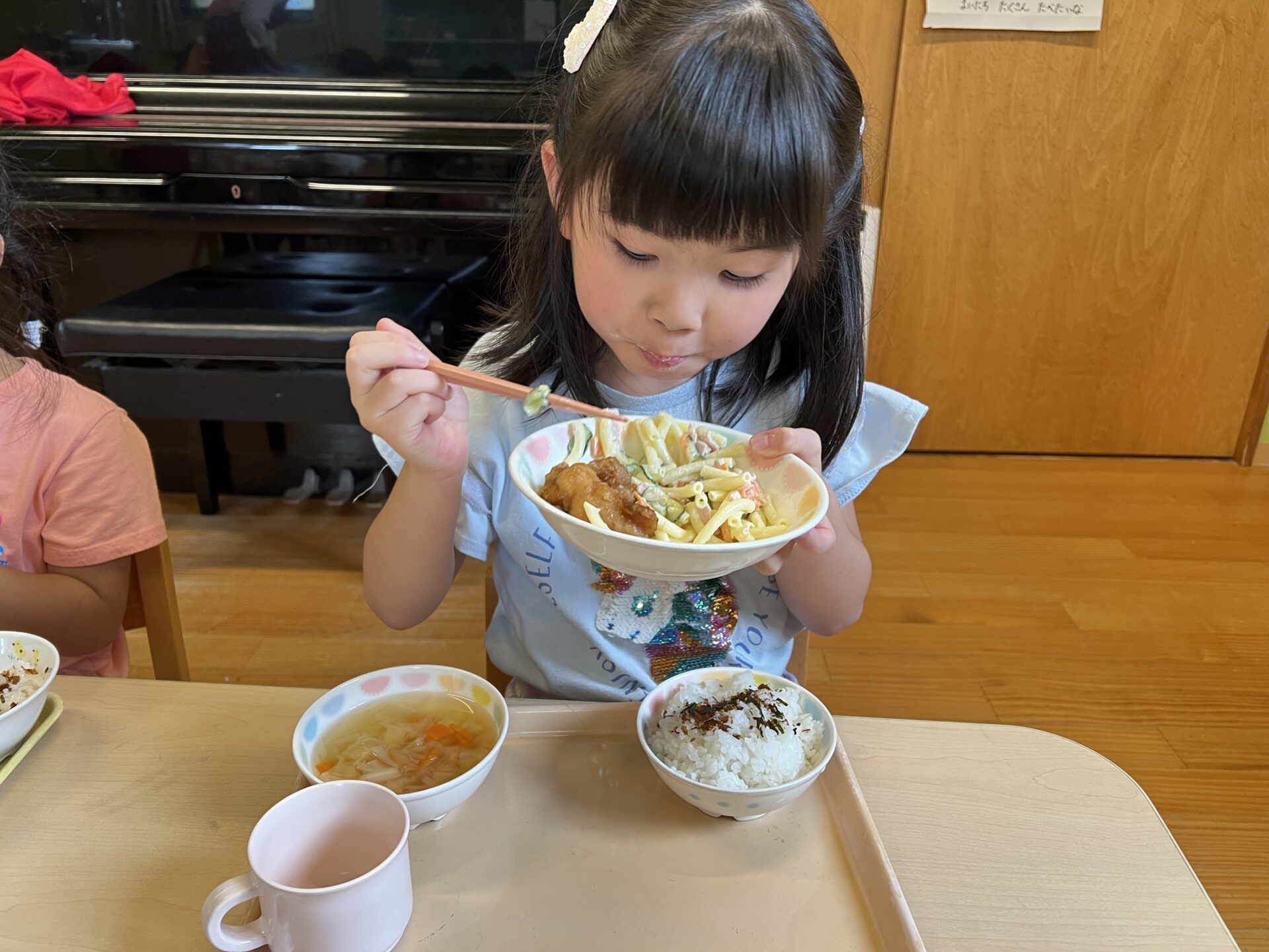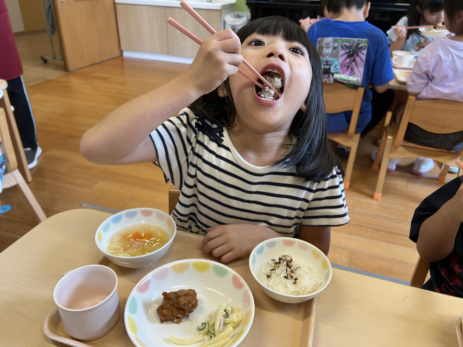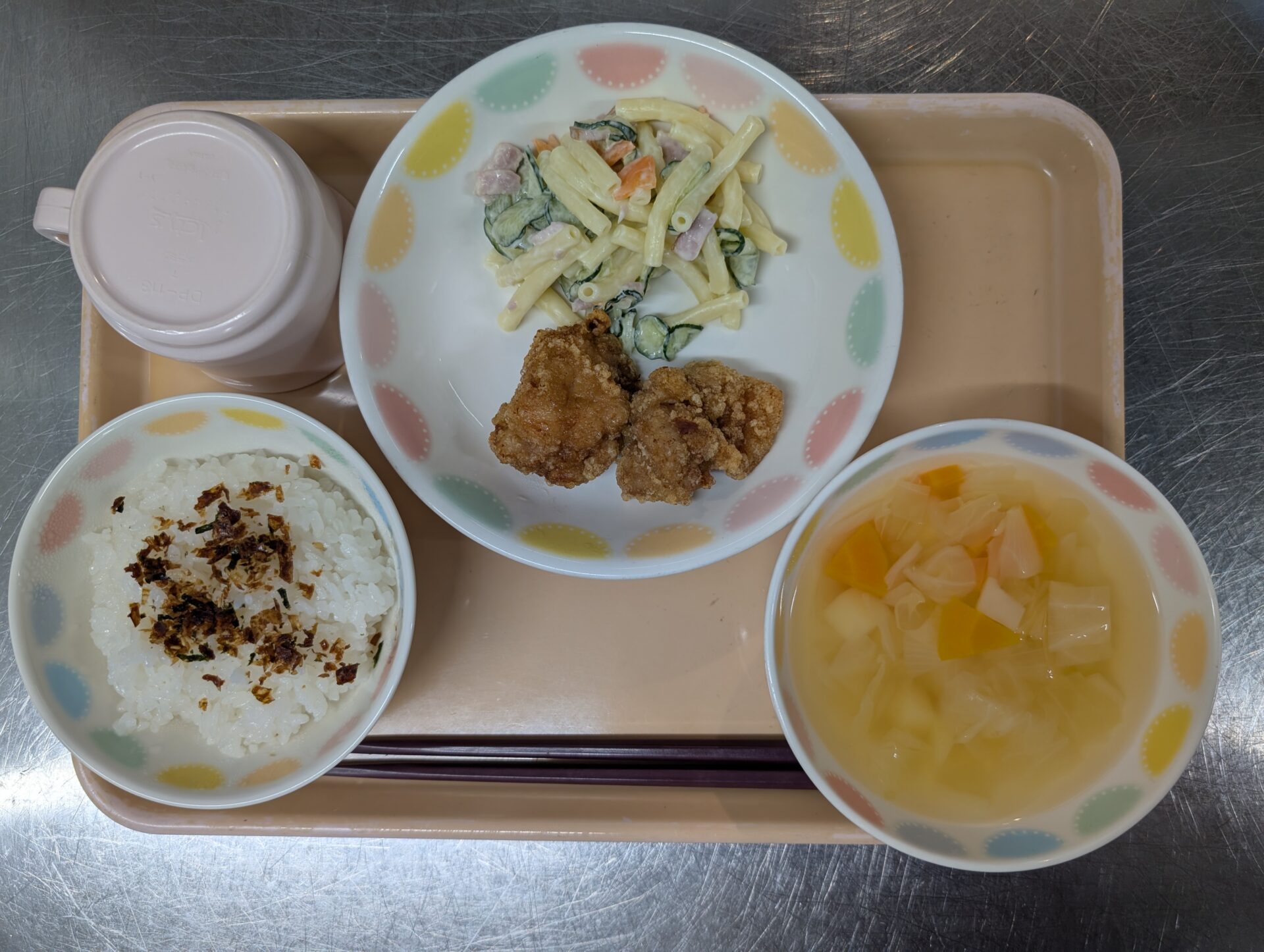 【お誕生日給食🎂】ふりかけごはん(おかか)、鶏のから揚げ、マカロニサラダ、ポトフ風スープです😊