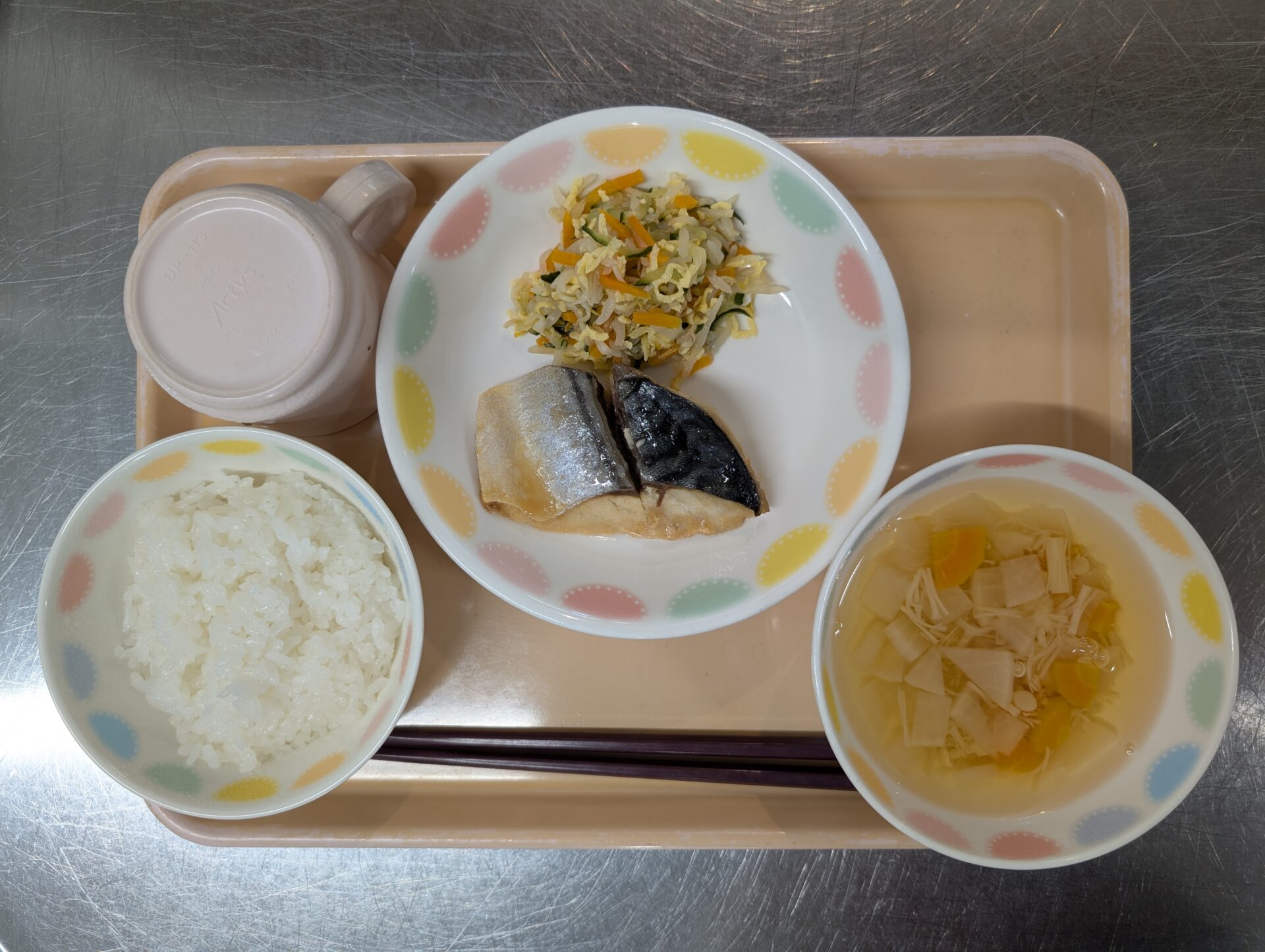 今日のメニューは、ご飯、さばの味噌煮、中華風サラダ、えのきのすまし汁です😊