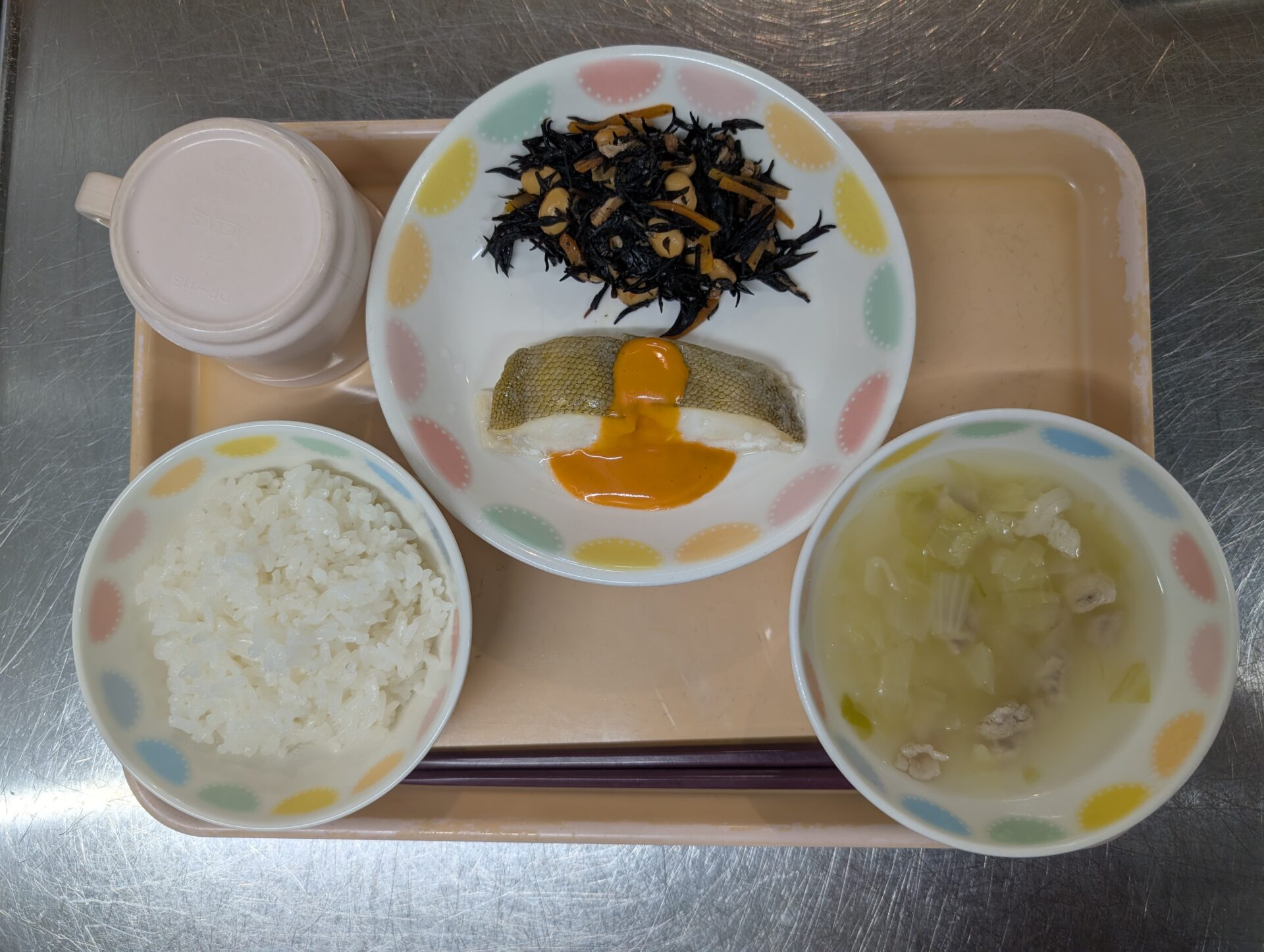 今日のメニューは、ご飯、カレイのオーロラソース焼き、大豆とひじきの煮物、春雨スープです😊