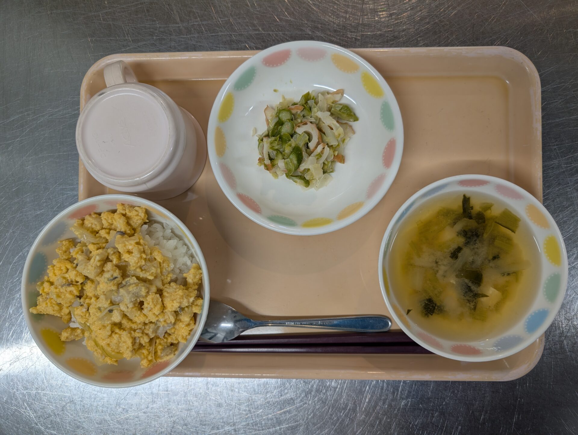 今日のメニューは、あぶたま丼、キャベツと竹輪のサラダ、豆腐の味噌汁です😊